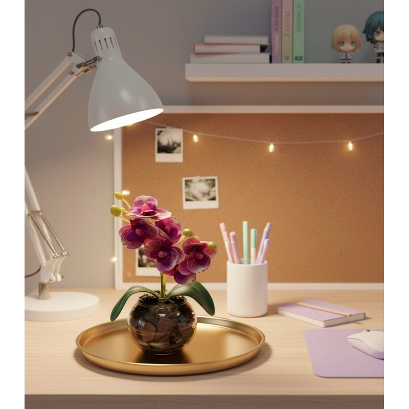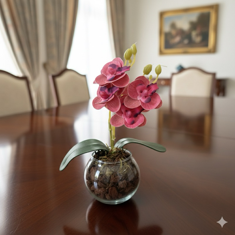 Mini Orquídea Diversas Cores Decoração Quarto Banheiro Flor Vaso Vidro Casca Pinus Acabamento
