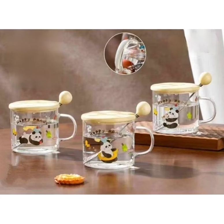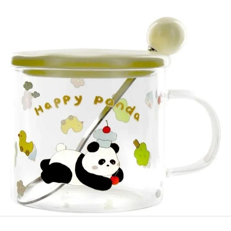 Caneca Happy Panda de Vidro com Tampa e Colher 🍃 350ml – Estilo Fofo e Grande retirada pela shopee express SPX Goiania