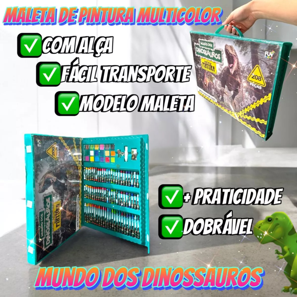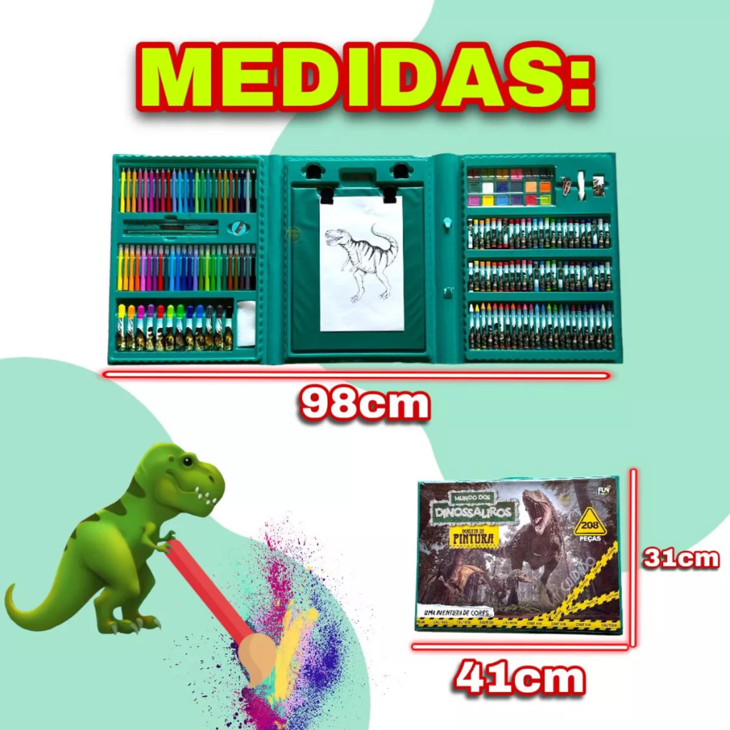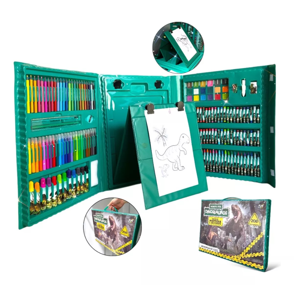 Estojo Maleta 208 Peças Infantil Dinossauro Escolar Pintura Menino