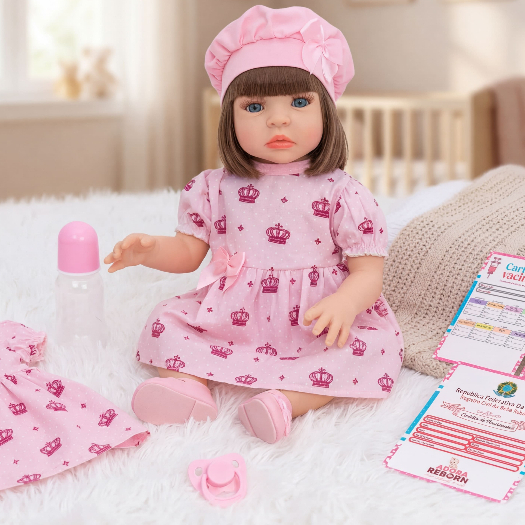 Boneca Bebê Reborn Vestido Coroa Rosa Realista Em Silicone Menina Original Pode dar Banho