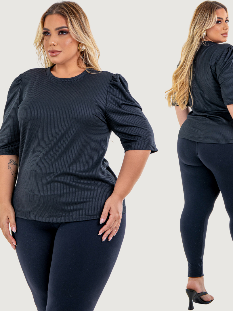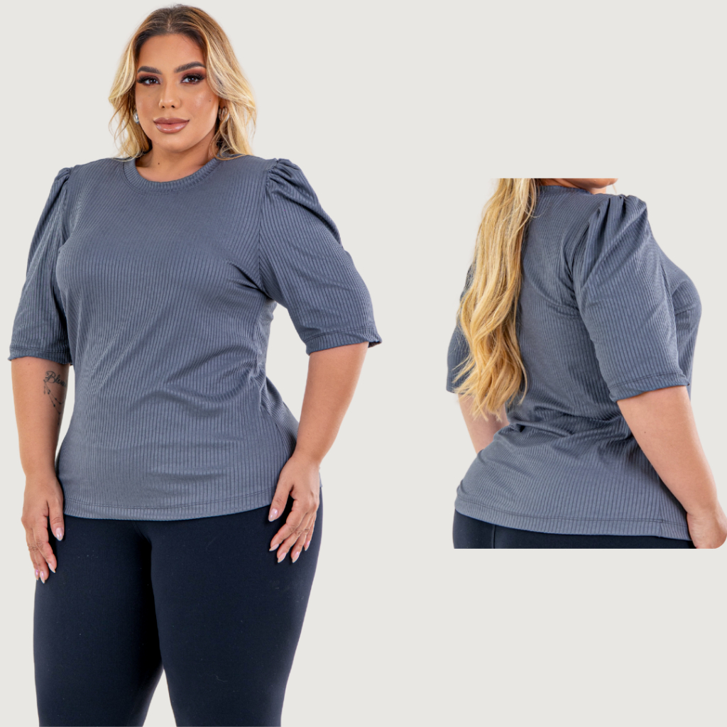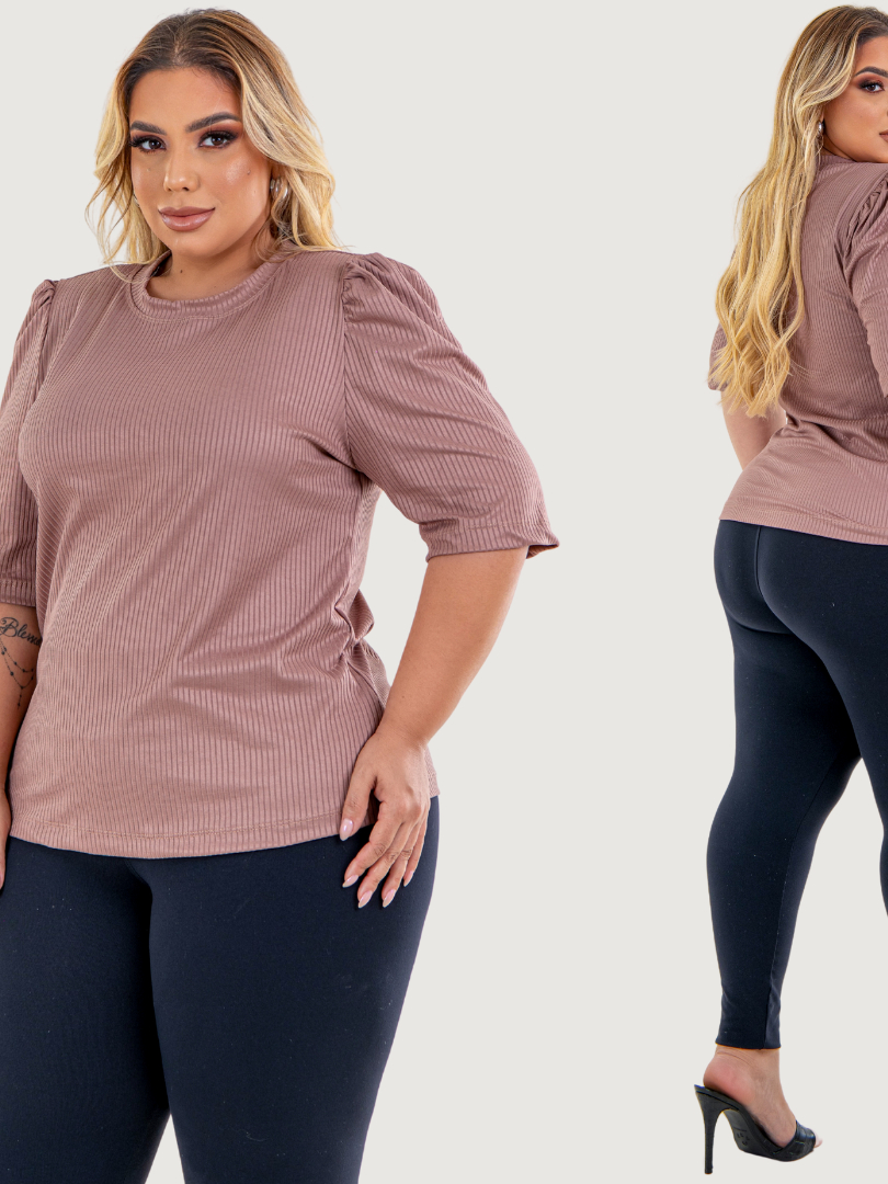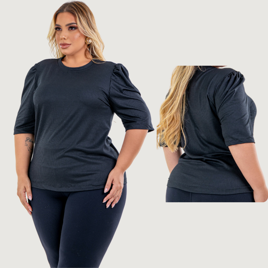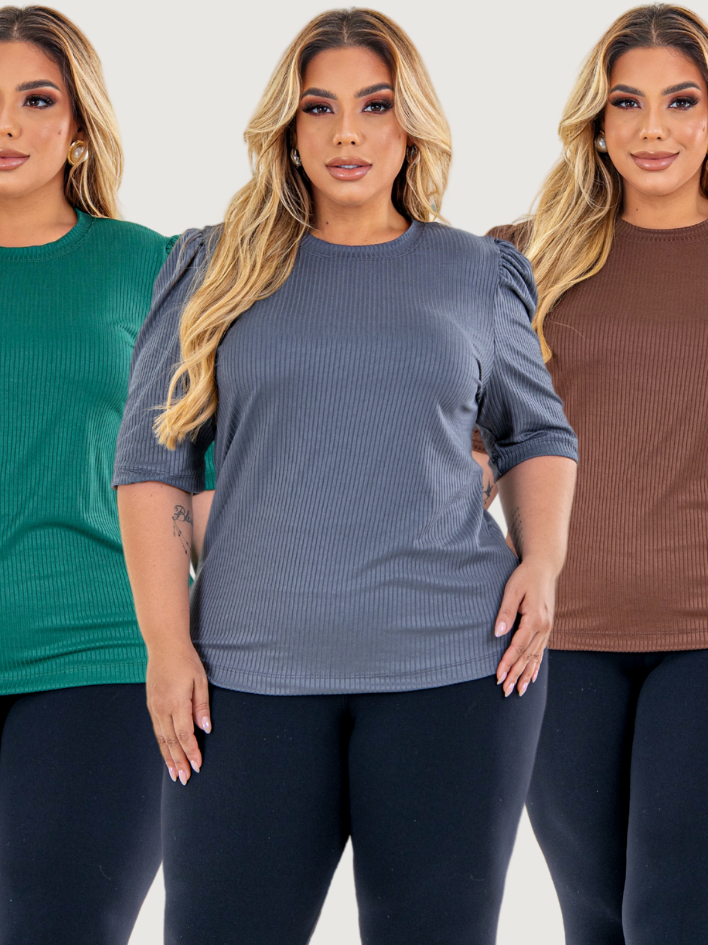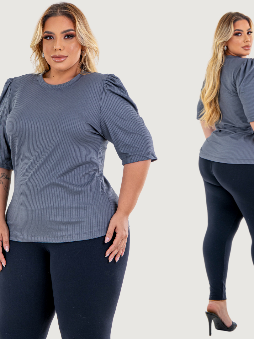 Blusa Canelada Plus Size Feminina Manga Bufante Elegante Moda Casual Confortável Gola Redonda