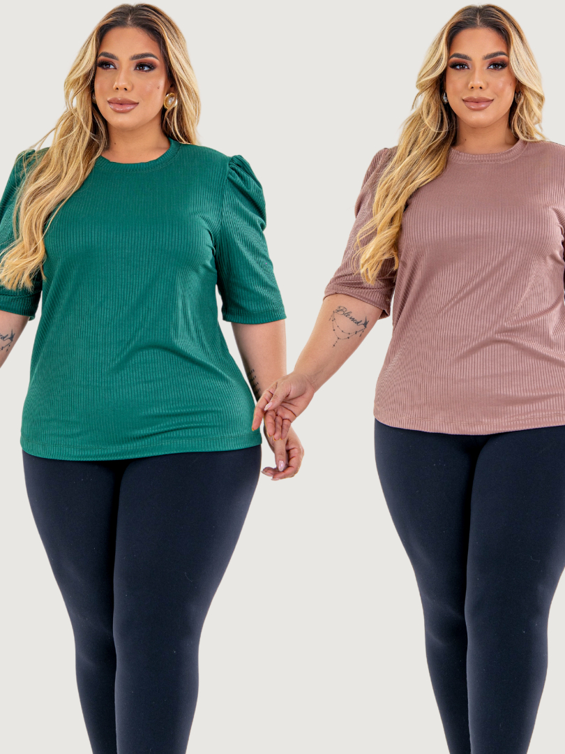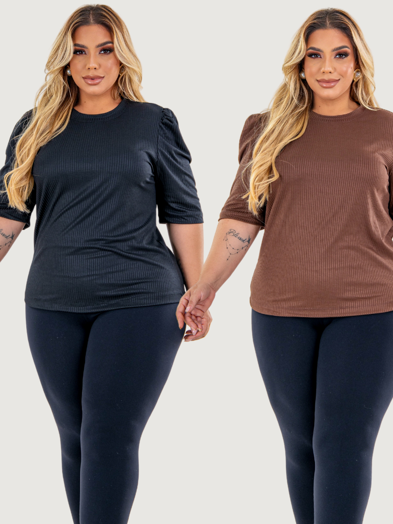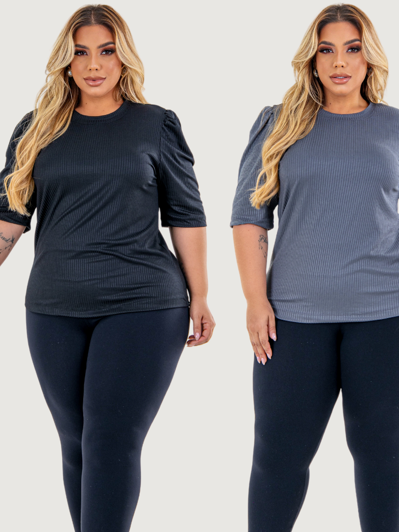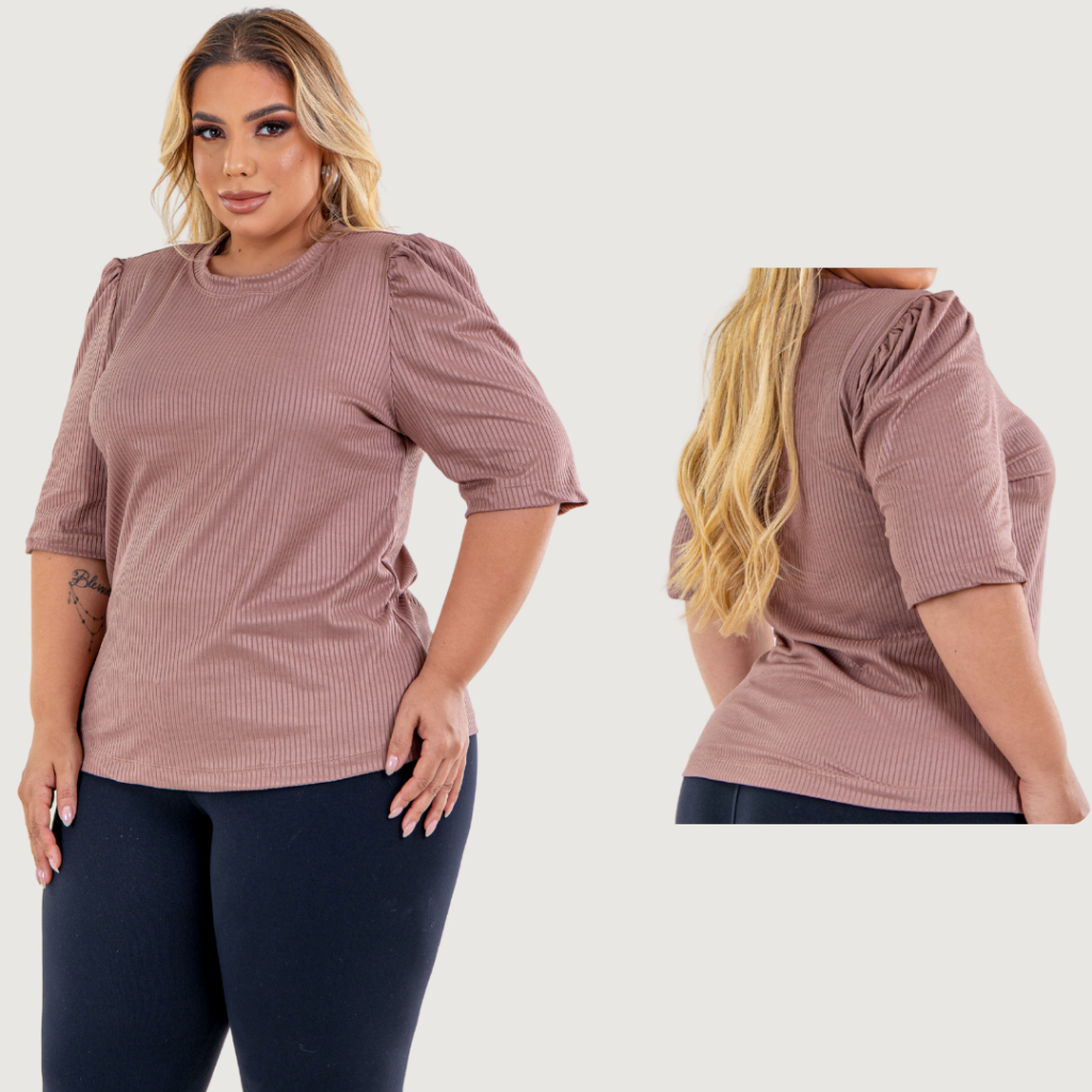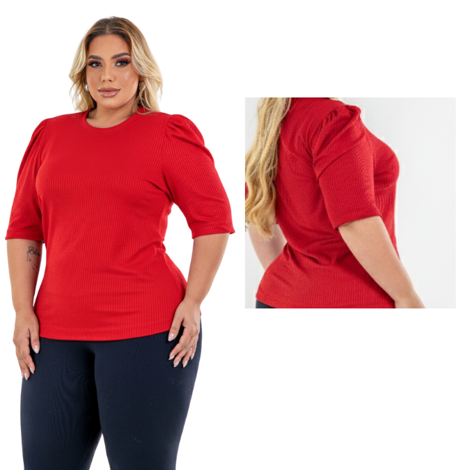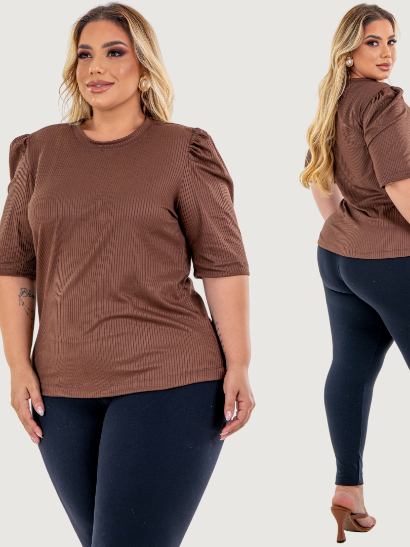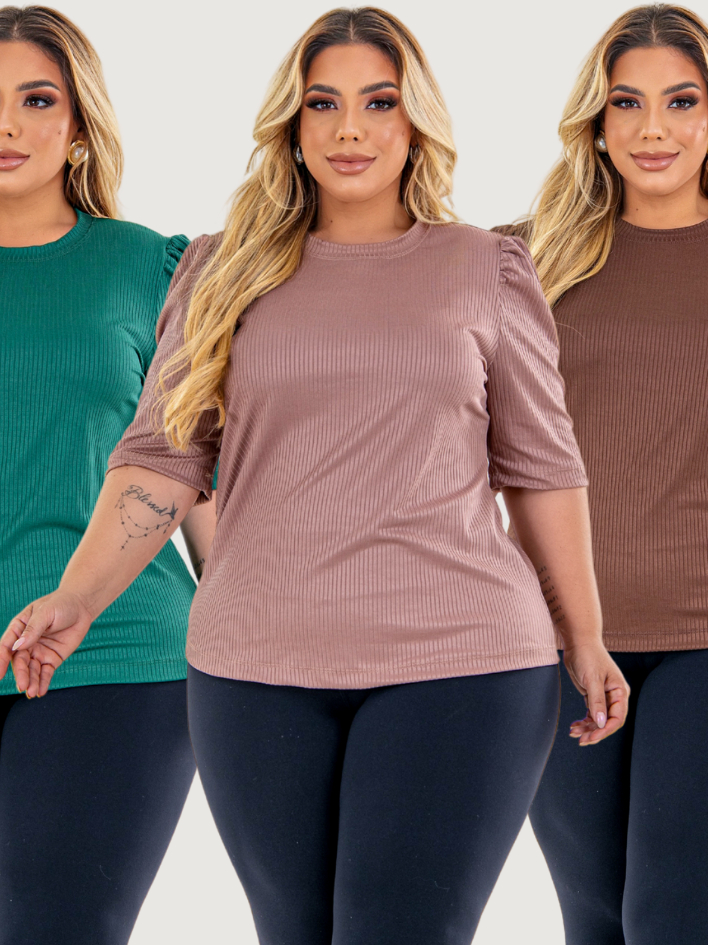 Blusa Canelada Plus Size Feminina Manga Bufante Elegante Moda Casual Confortável Gola Redonda