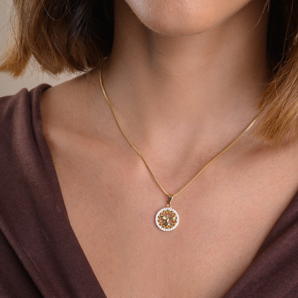 Colar Espírito Santo Medalha Cravejada com Banho em Ouro 18k