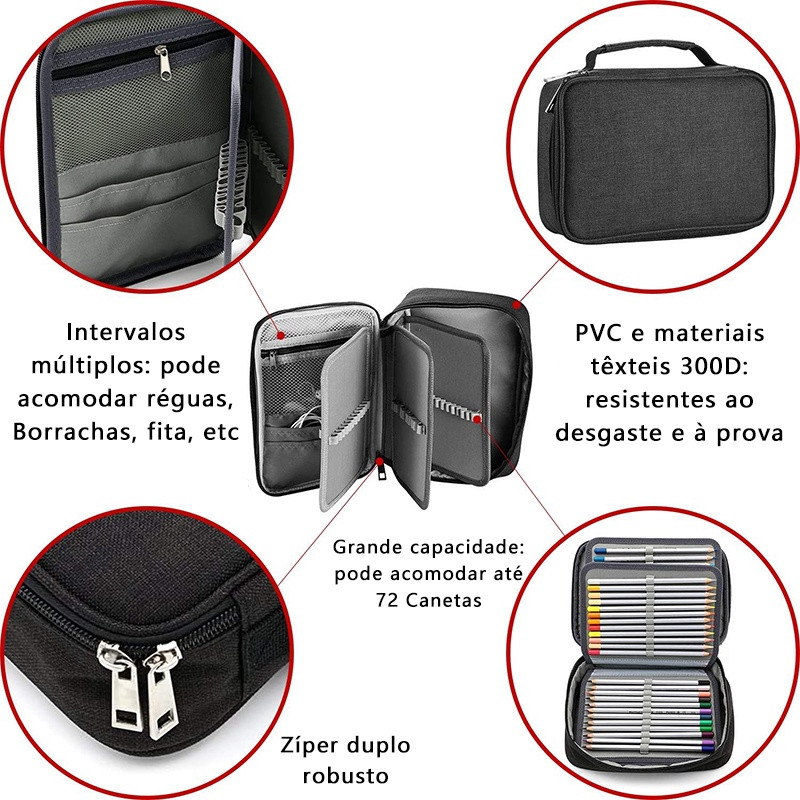 Estojo 72 Pens Escolar Box Nylon Com Alça Feminino/Masculino Organizador Com Divisórias Zíper Infantil