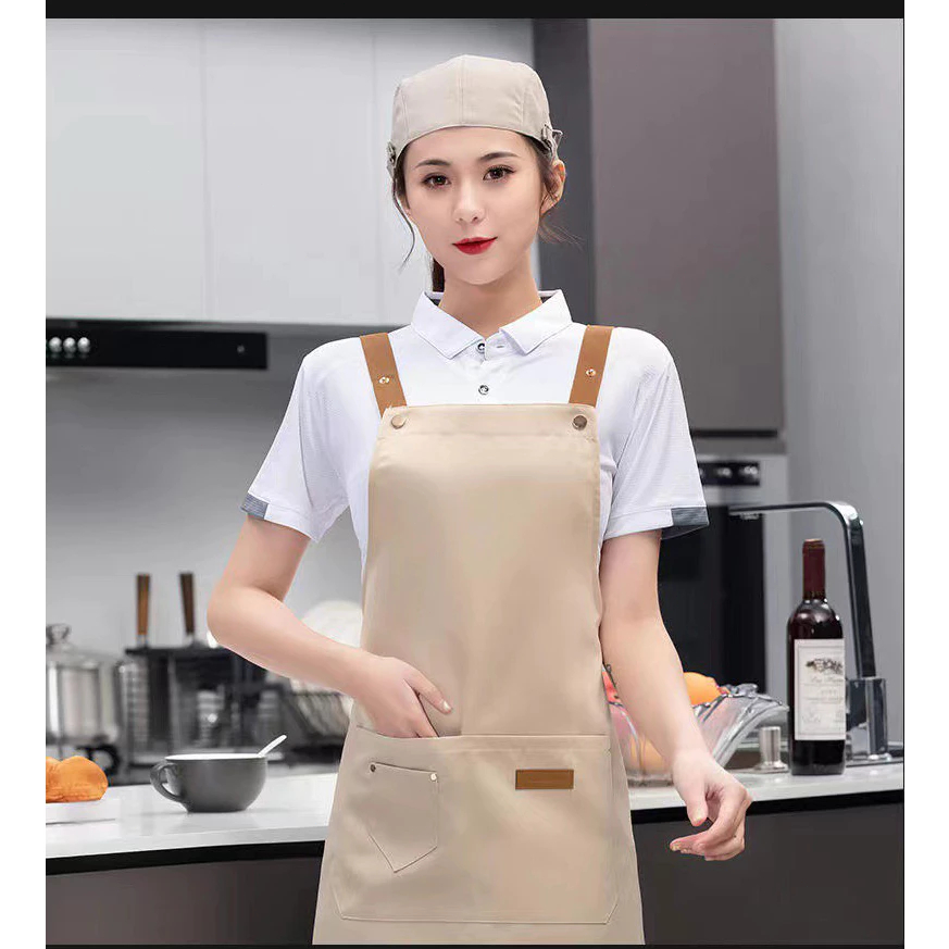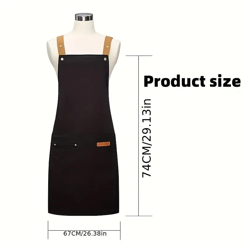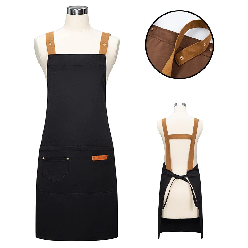 Avental impermeável com alças de ombro ajustáveis, adequado para restaurantes e cafés.