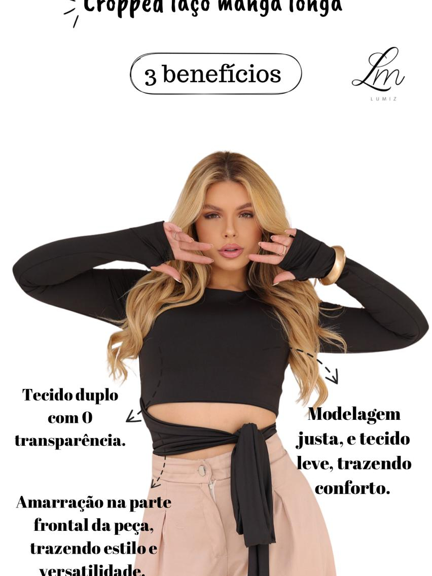 Blusa Cropped Feminino Manga Longa Com Laço Amarração Lateral Suplex Lançamento