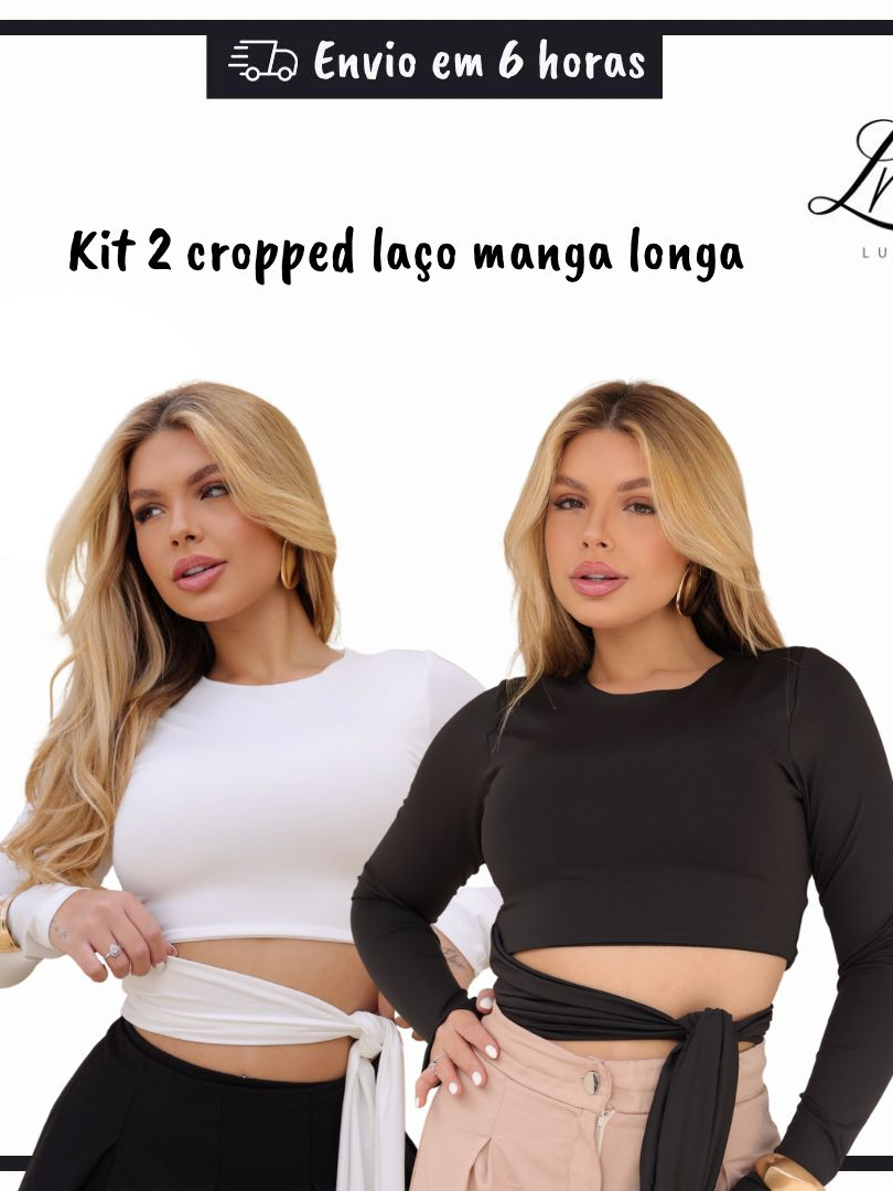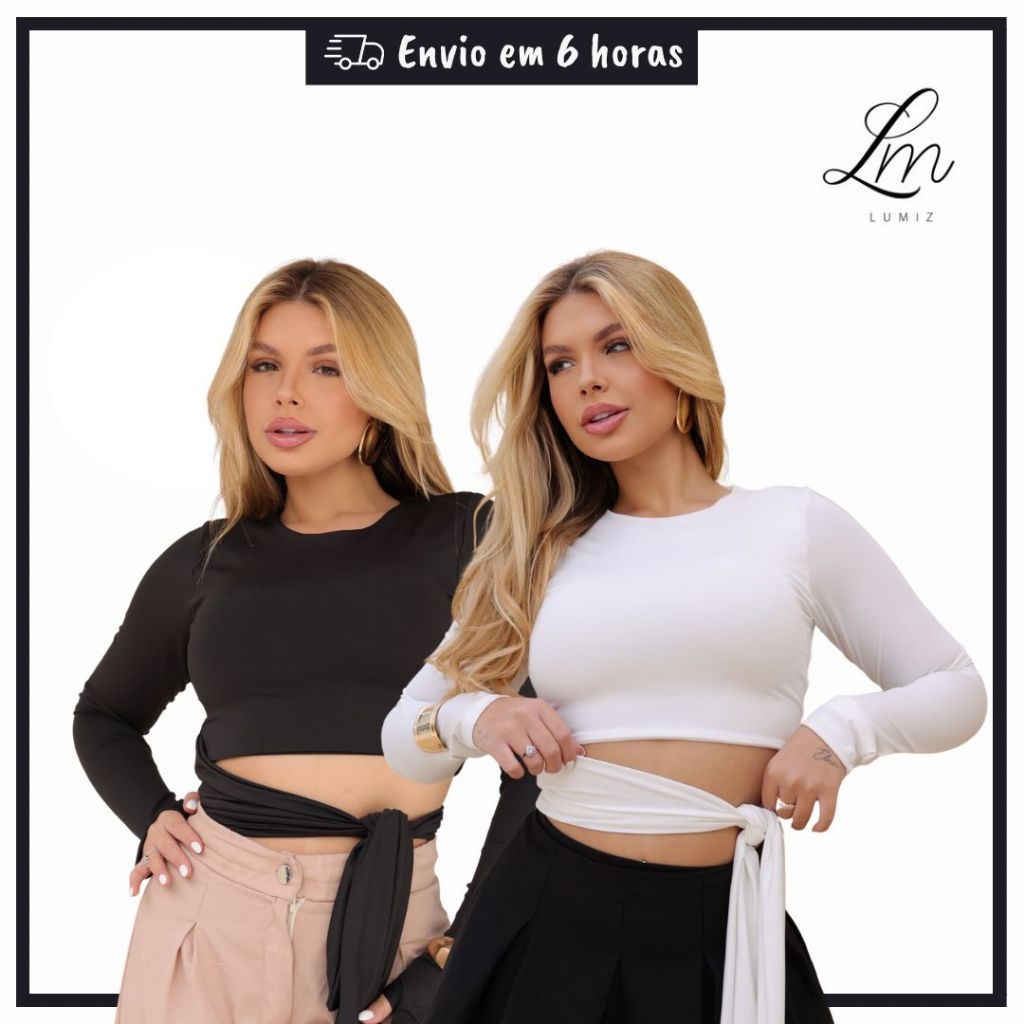Kit 2 Blusa Cropped Feminino Manga Longa Com Laço Amarração Lateral Suplex Lançamento