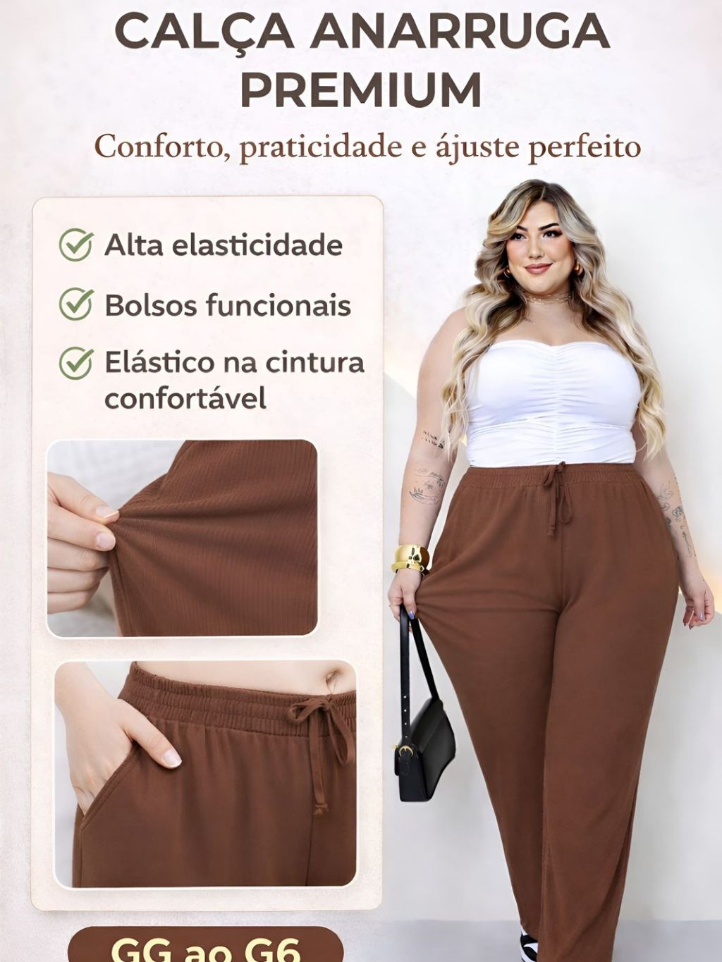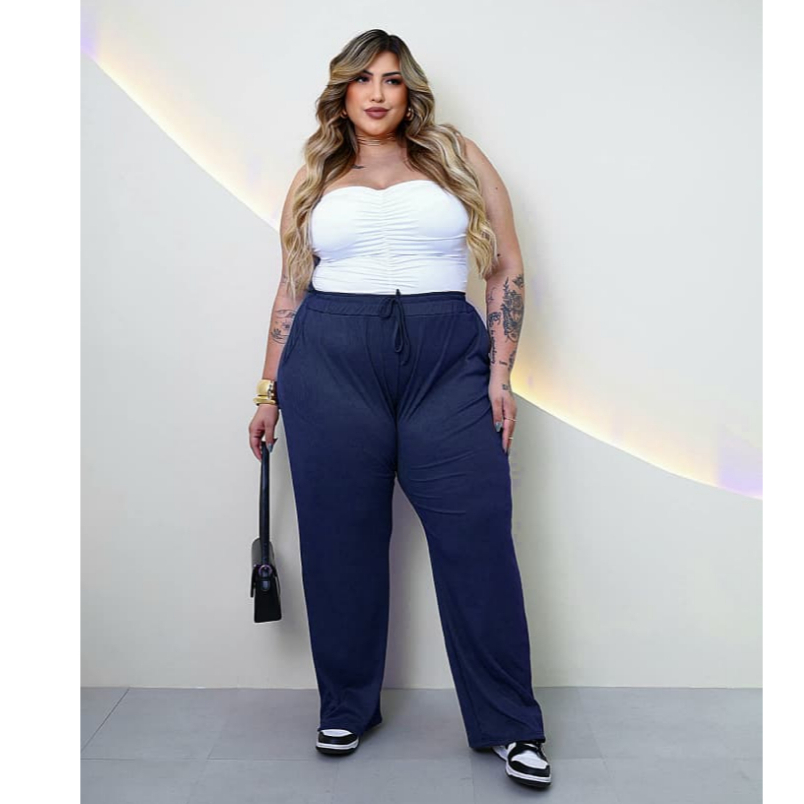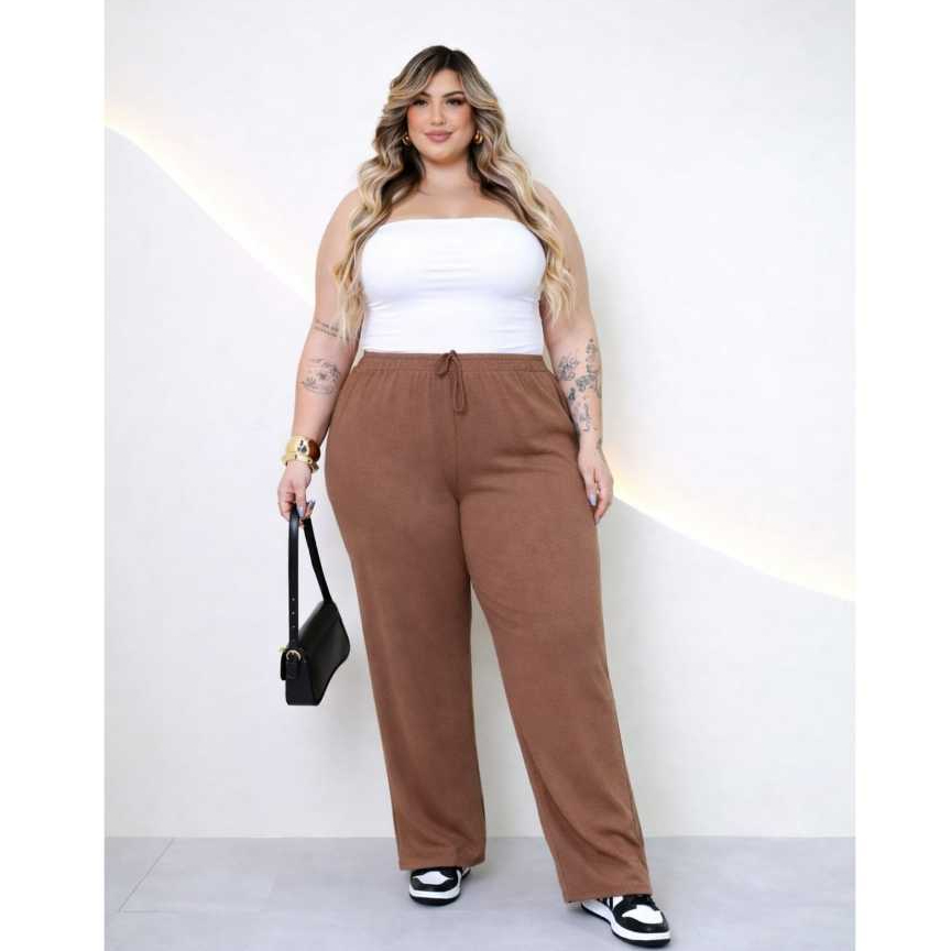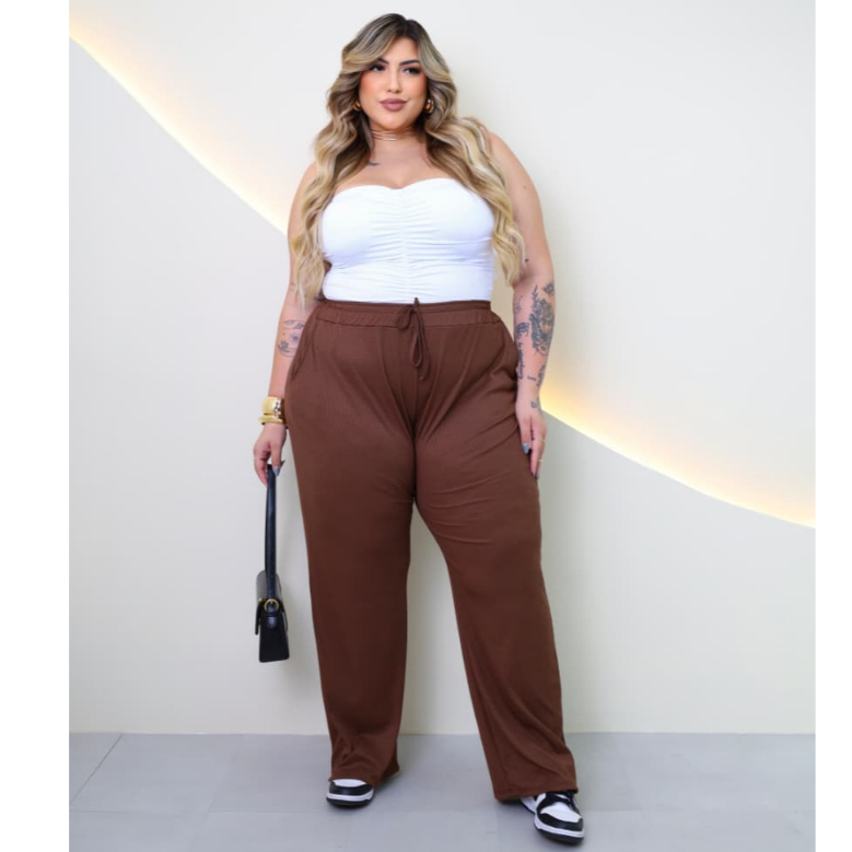Calça Feminina Plus Size Pantalona Cintura Alta Bolso G1 G6 PLUS DE VERDADE Malha Canelada Premium