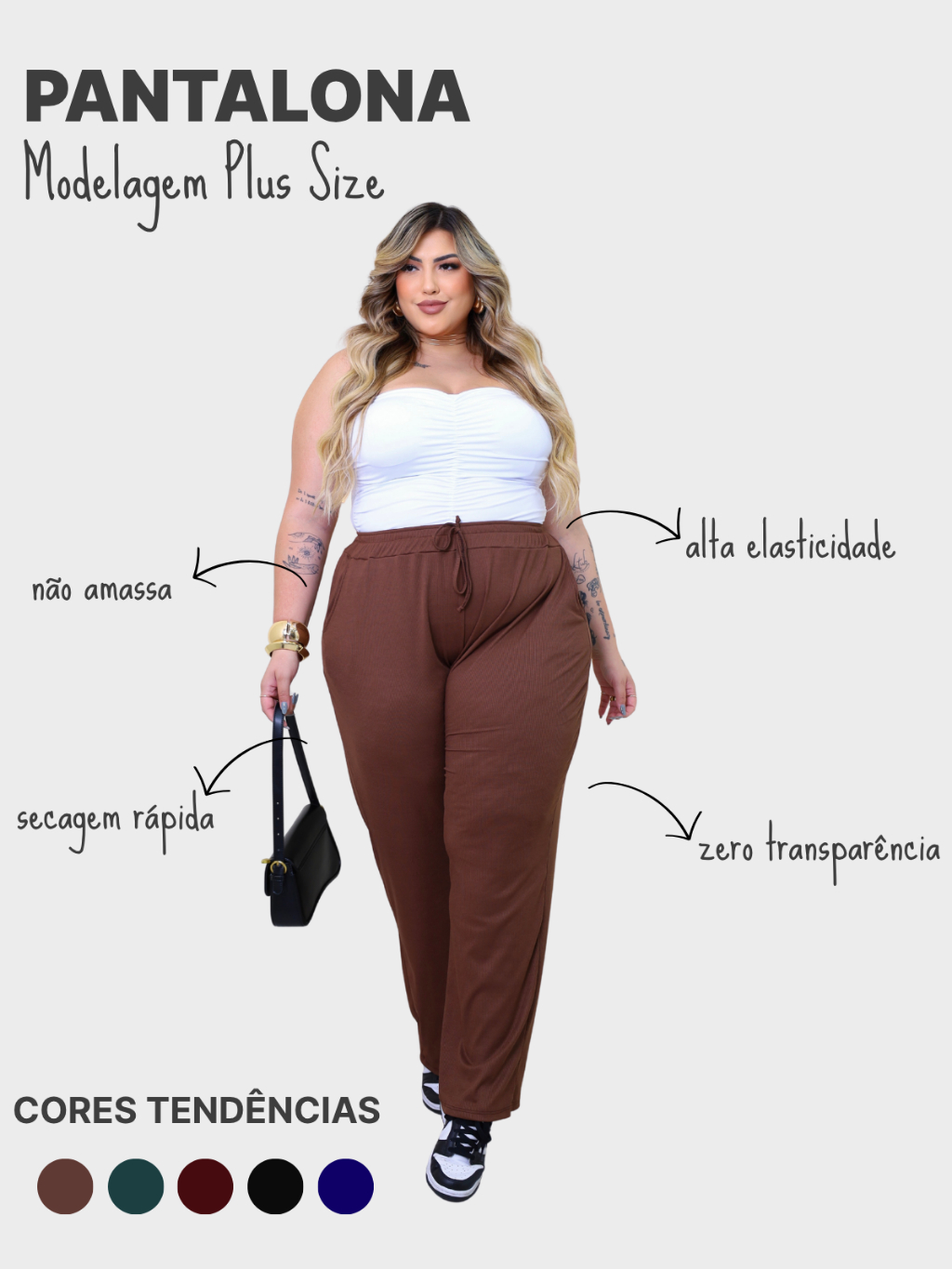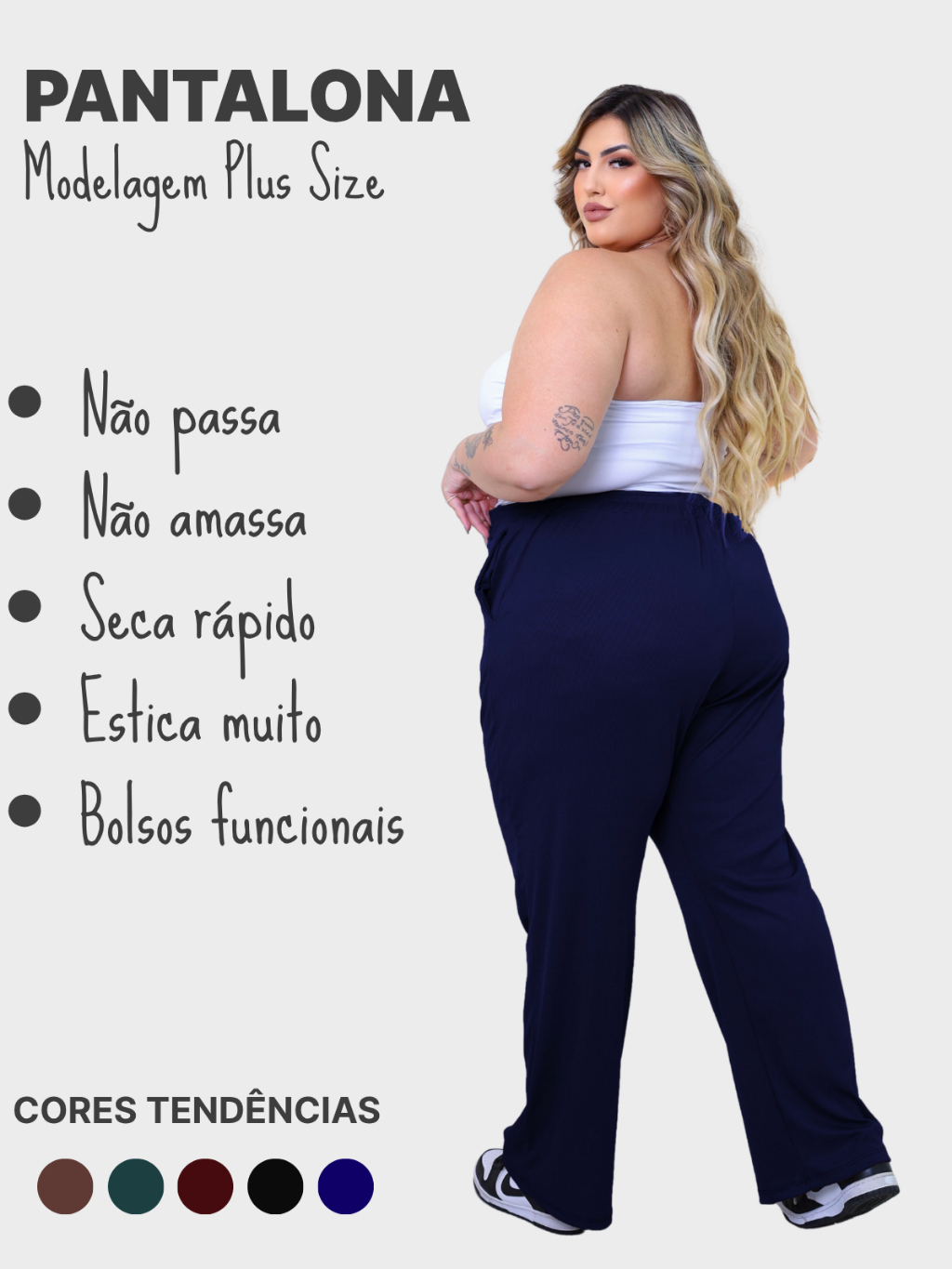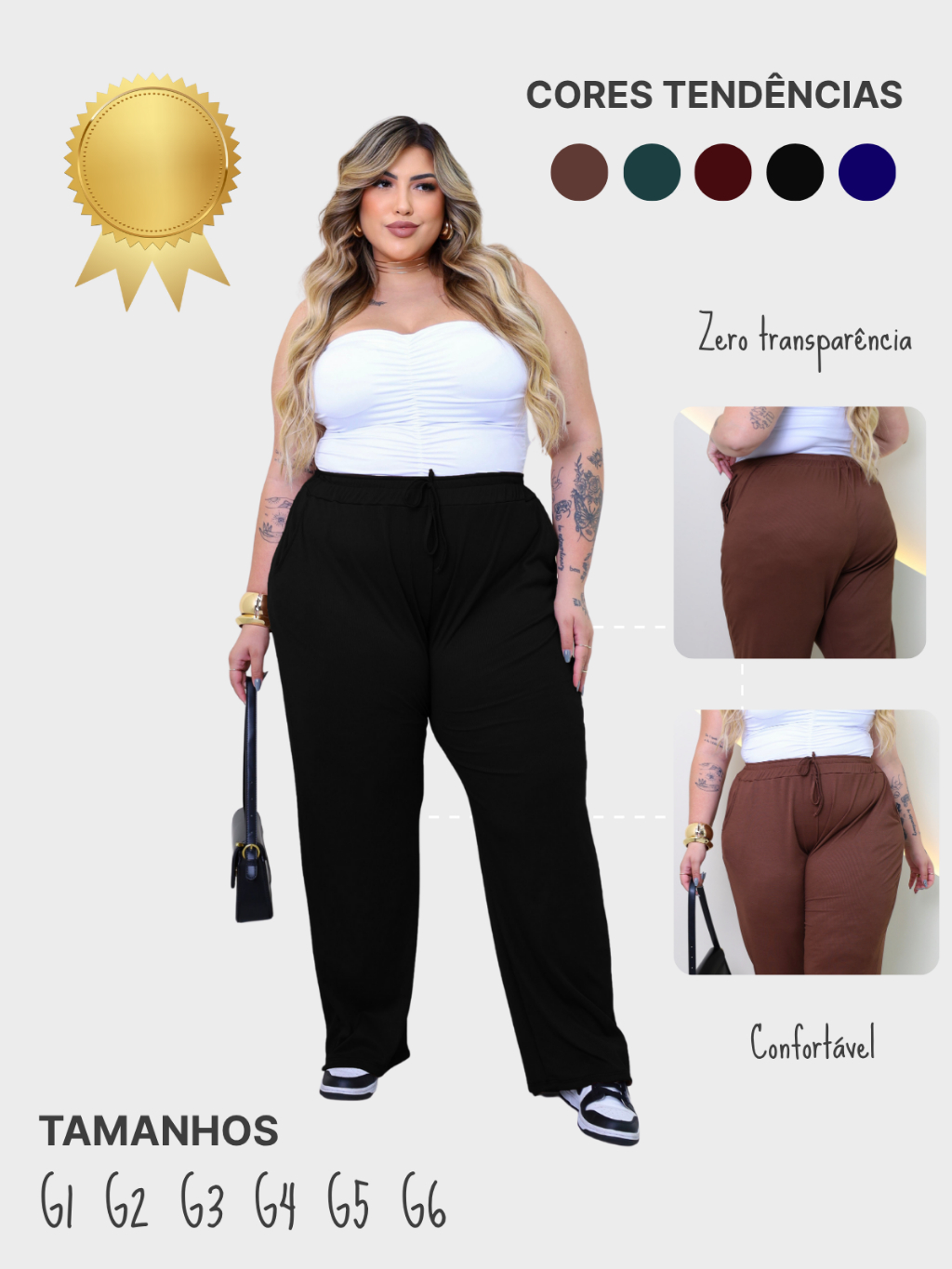 Calça Feminina Plus Size Pantalona Cintura Alta Bolso G1 G6 PLUS DE VERDADE Malha Canelada Premium