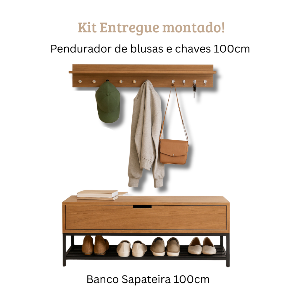 Kit com banco sapateira recamier balcão aparador e pendurador de chaves cabideiro de parede 100cm