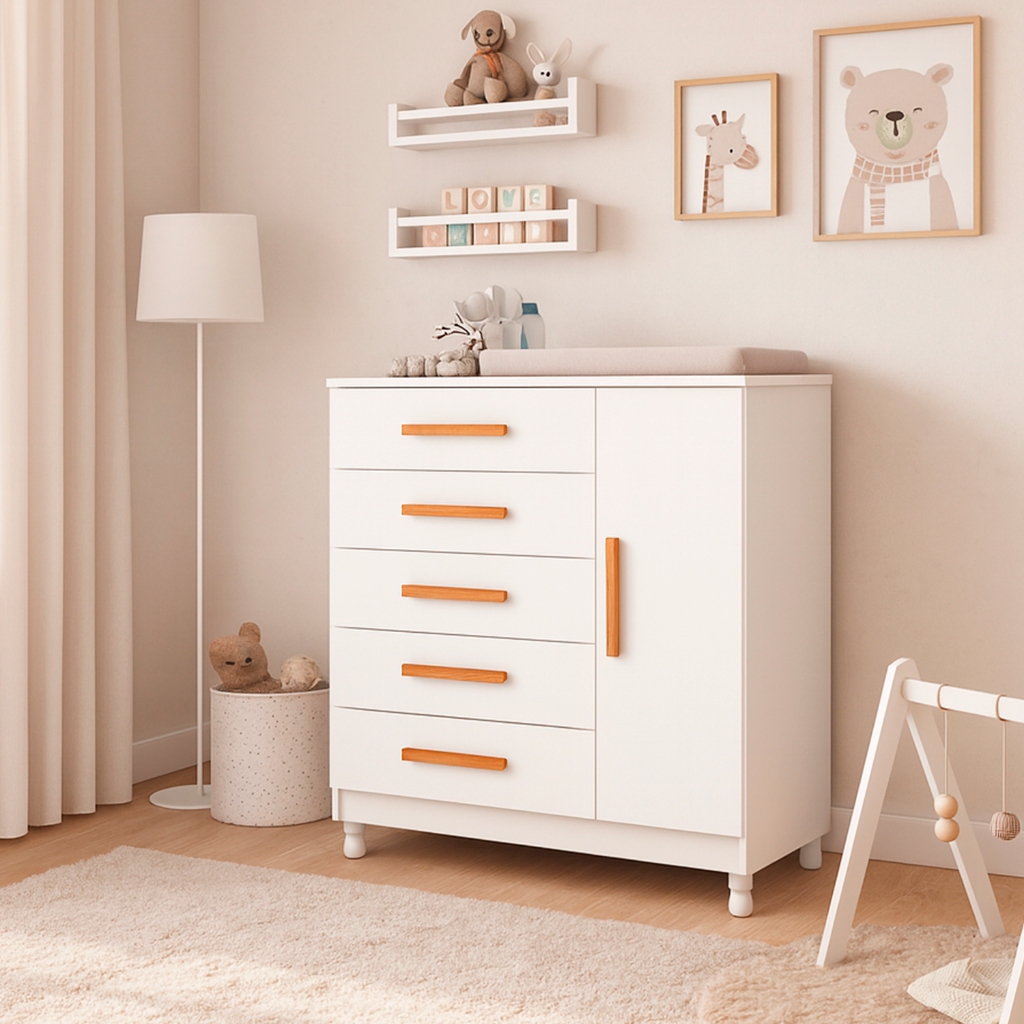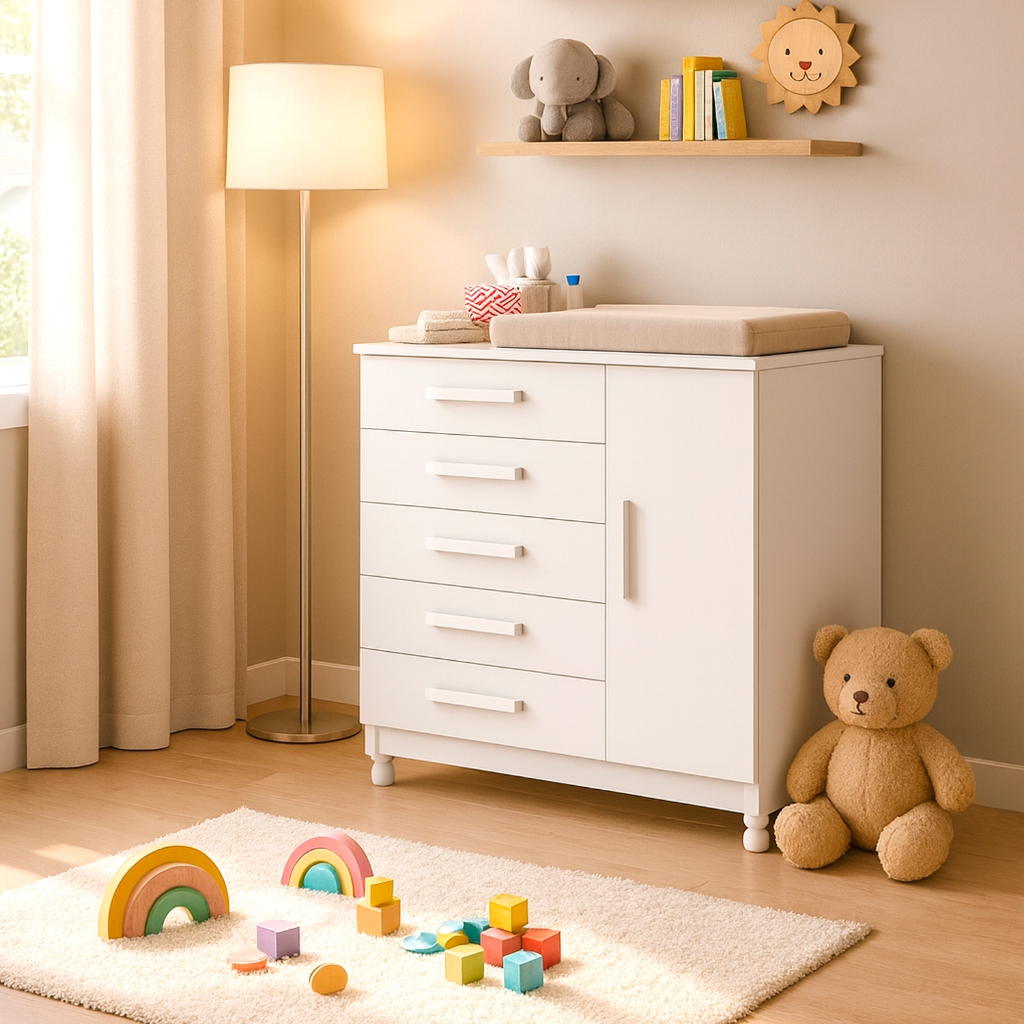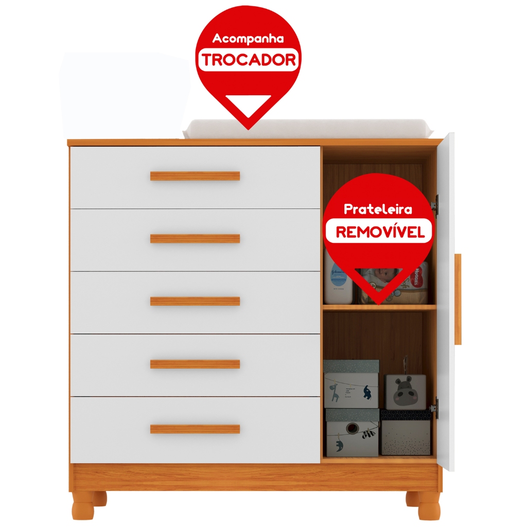 Cômoda para Quarto de Bebê Branco MDF com Trocador Incluso, 5 Gavetas e Porta com Prateleira Interna