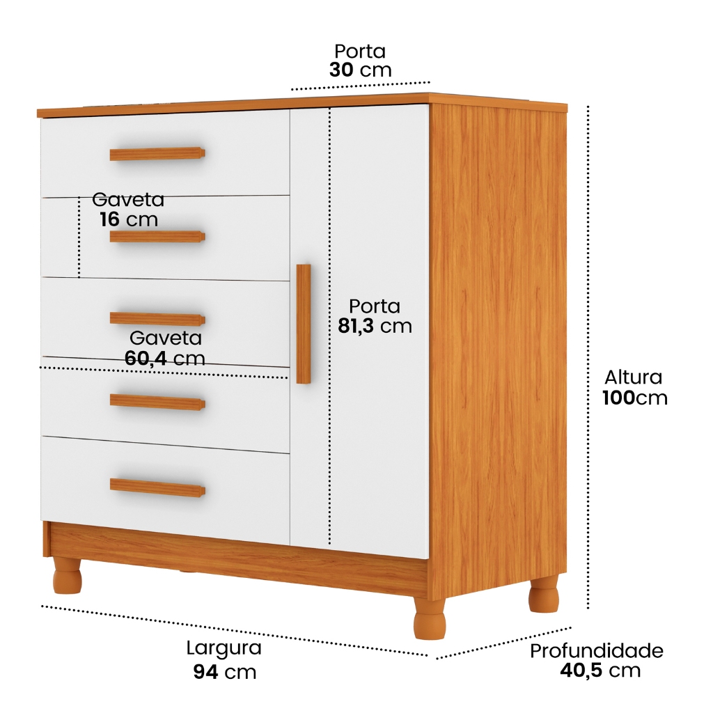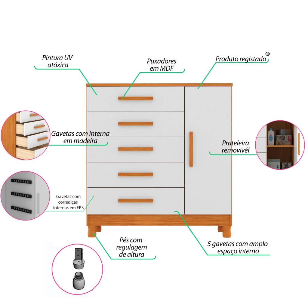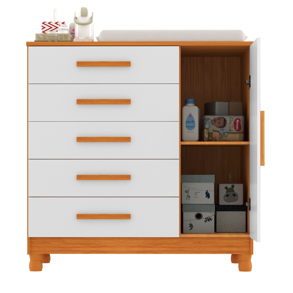 Cômoda para Quarto de Bebê Branco MDF com Trocador Incluso, 5 Gavetas e Porta com Prateleira Interna