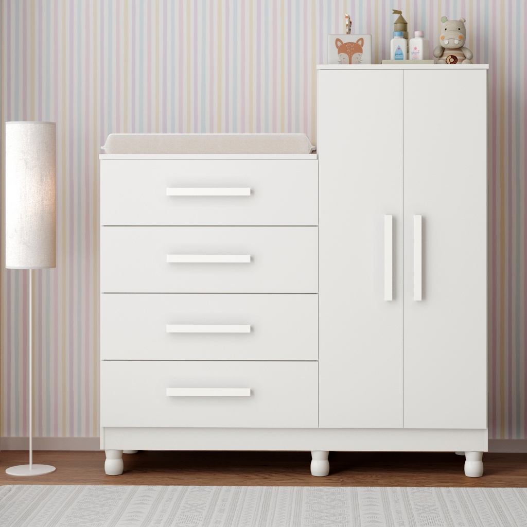 Cômoda Roupeiro Infantil Trocador 4 Gavetas Porta Guarda-Roupas Bebê Branco quarto multifuncional