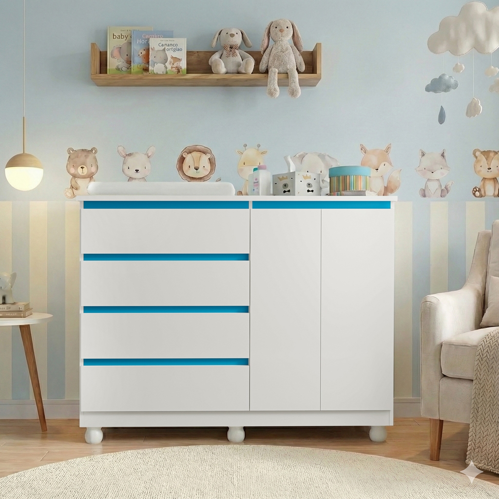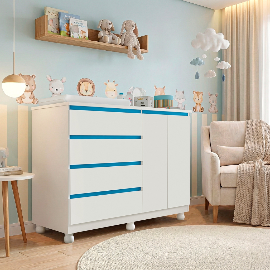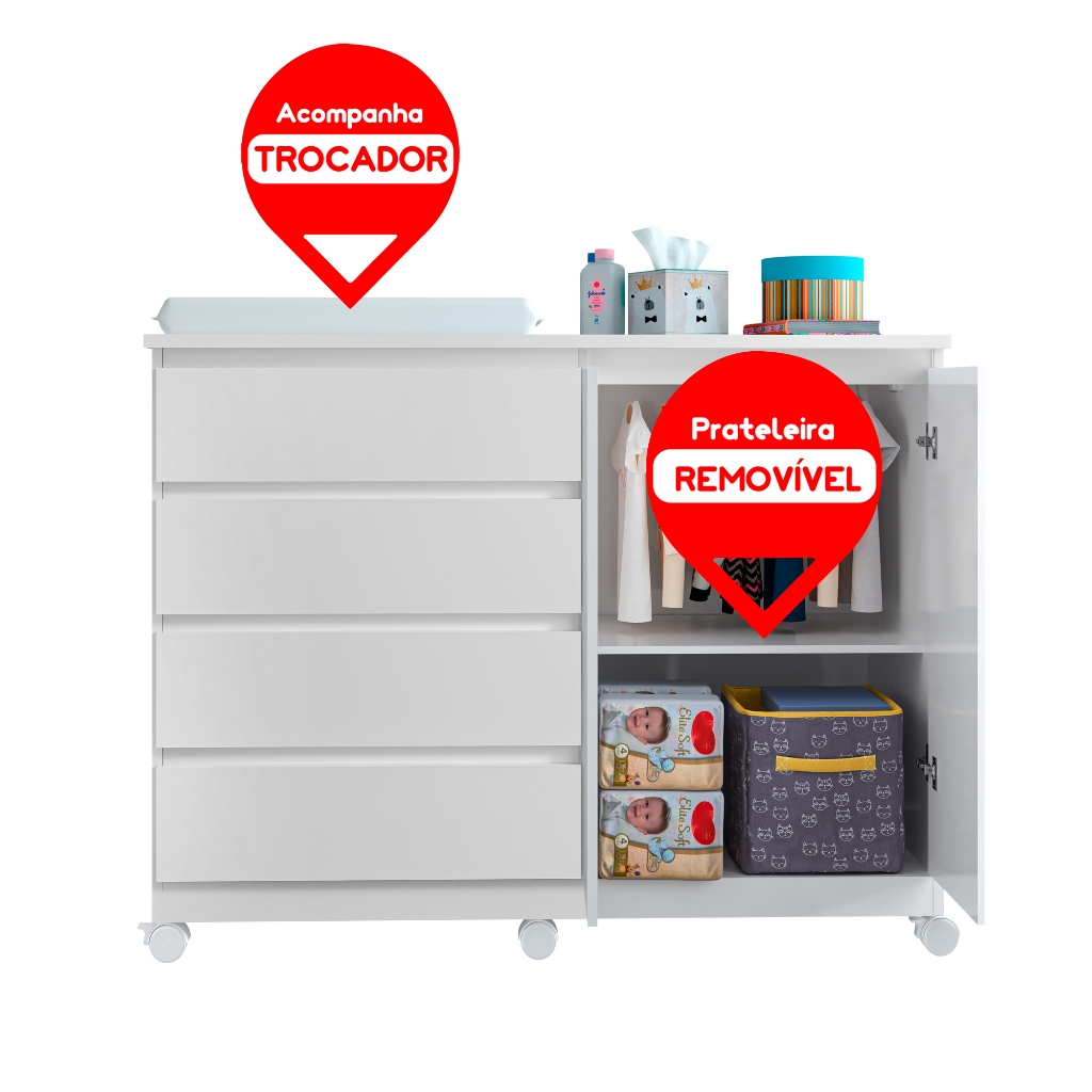 Cômoda Infantil Multiuso com Trocador 4 Gavetas 2 Porta Cabideiro Alumínio Rodízios com Trava