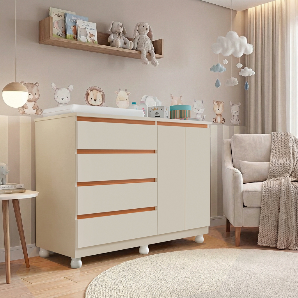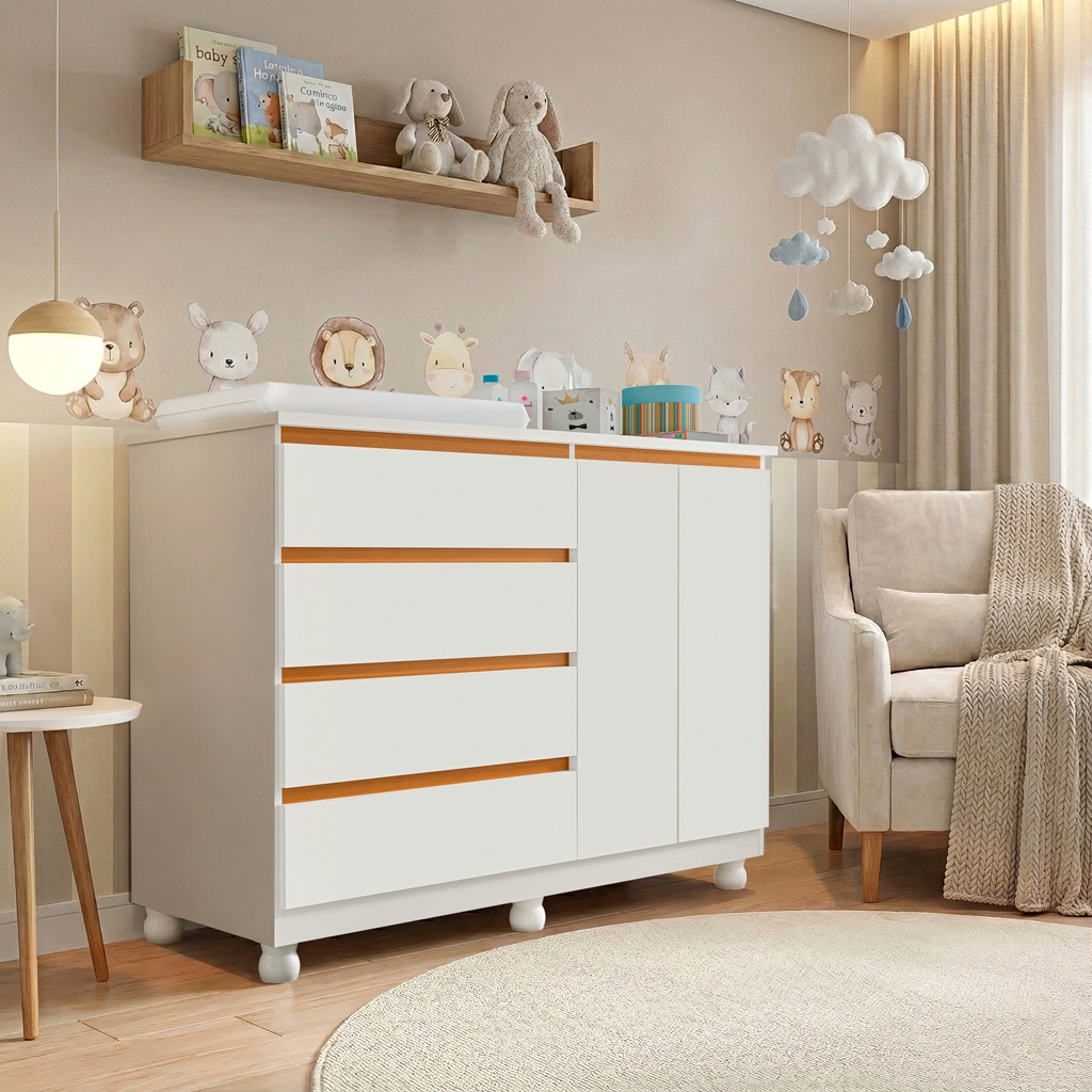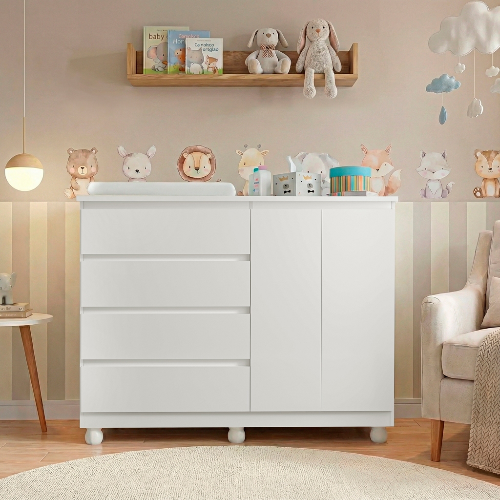 Cômoda Infantil Multiuso com Trocador 4 Gavetas 2 Porta Cabideiro Alumínio Rodízios com Trava