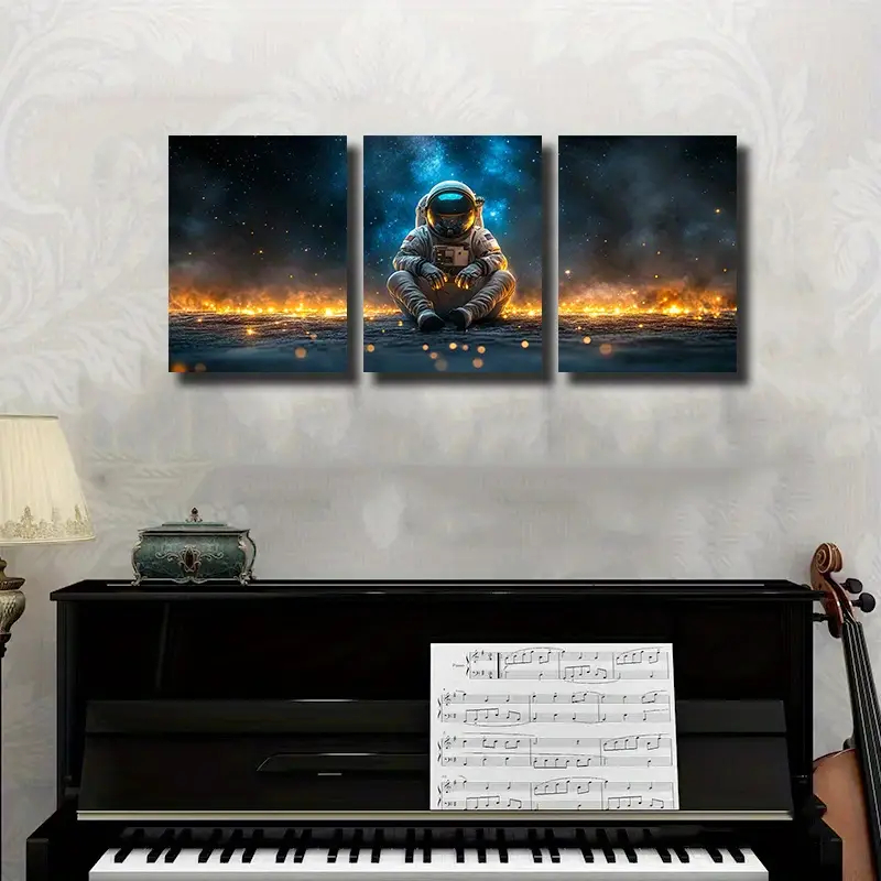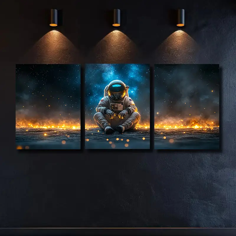 Kit Quadro decorativo 3 Peças Astronauta Espaço Galáxia Brilhante Sala Quarto Escritório