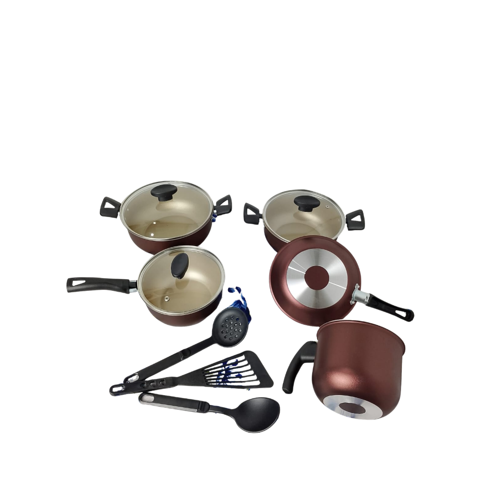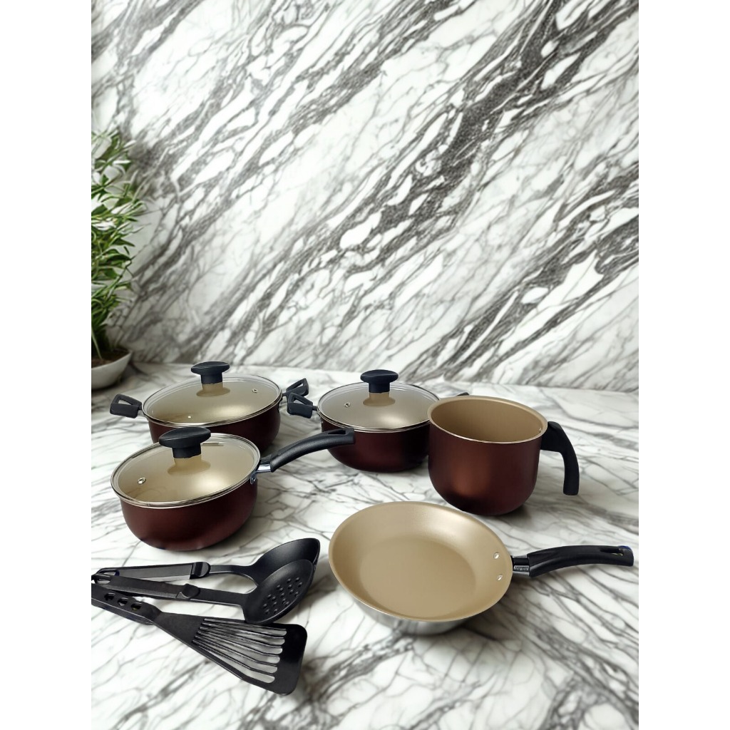 Kit Panelas Antiaderentes - MARROM & BEGE com Tampas de Vidro (Jogo com 8 peças, com 5 camadas de Teflon Premium)