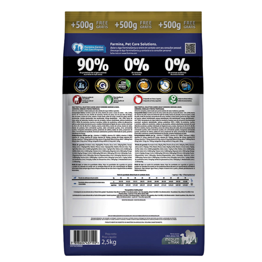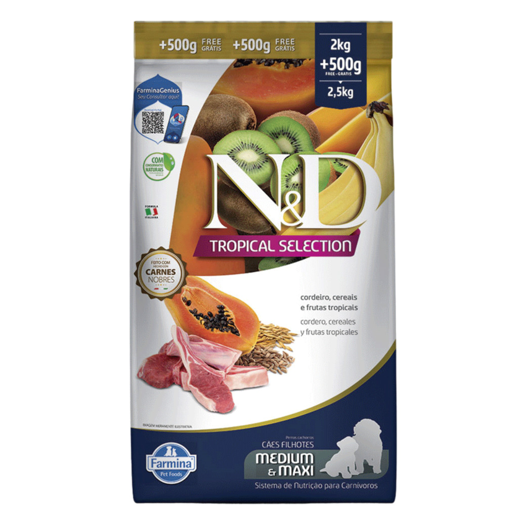 Ração N&D Tropical Selection Cães Filhotes 2kg + 500g Grátis Porte Médio e Grande Sabor Cordeiro, Cereais e Frutas Tropi