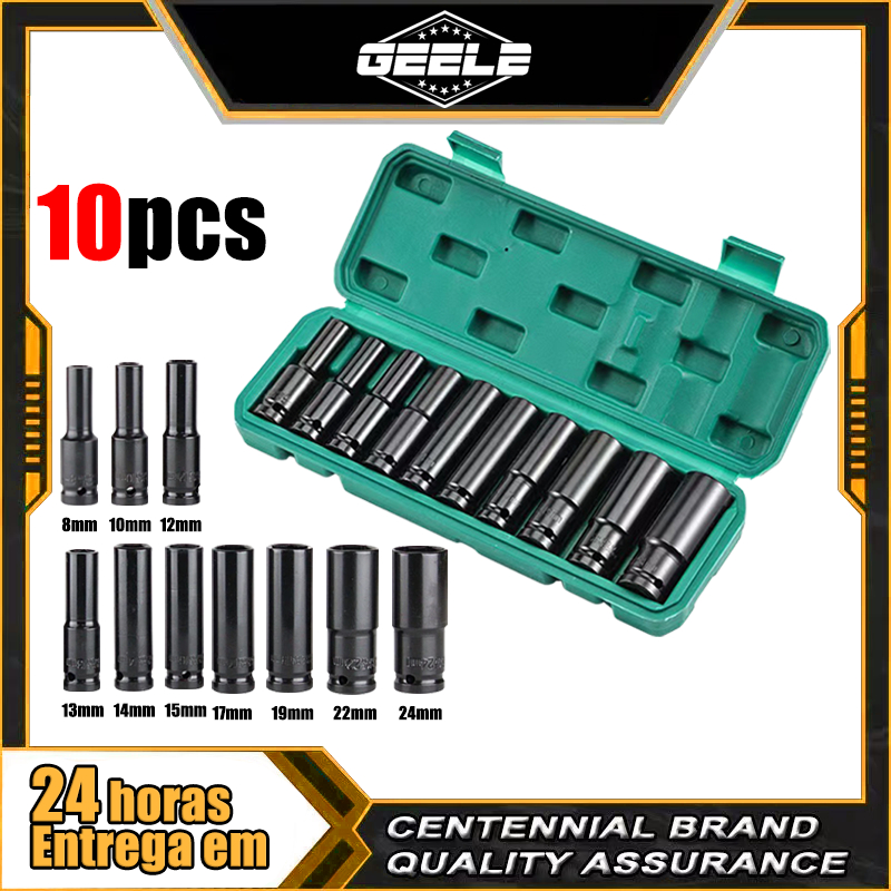 Jogo10PCS (8mm-24mm) Conjunto De Soquetes De Impacto Longo Preto Ferramentas Redutor De