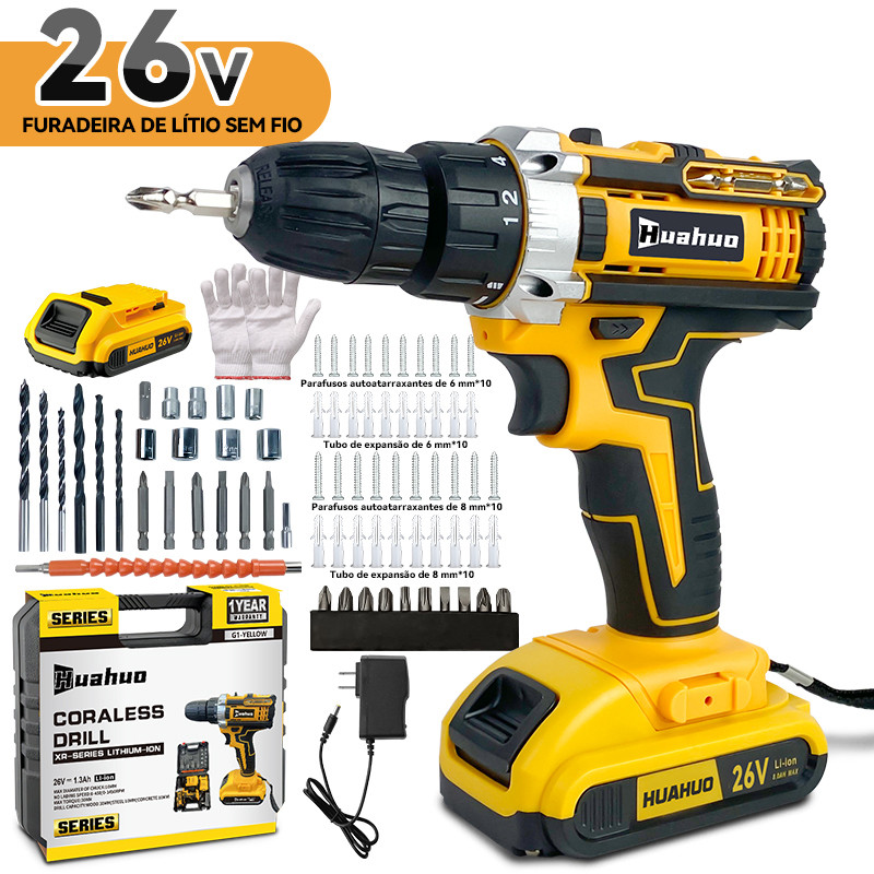 110V/220V Parafusadeira Furadeira Elétrica Amarela / Verde 26V 2 Baterias Com Maleta e Acessórios Completo