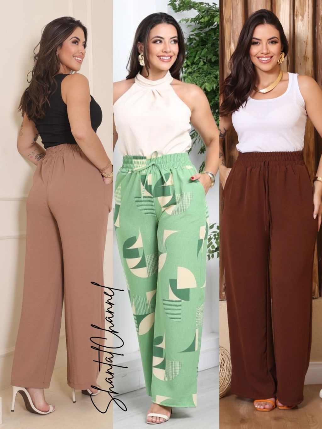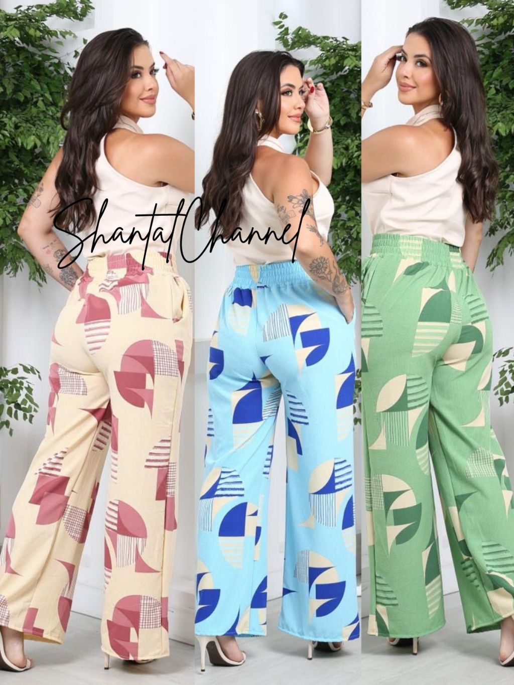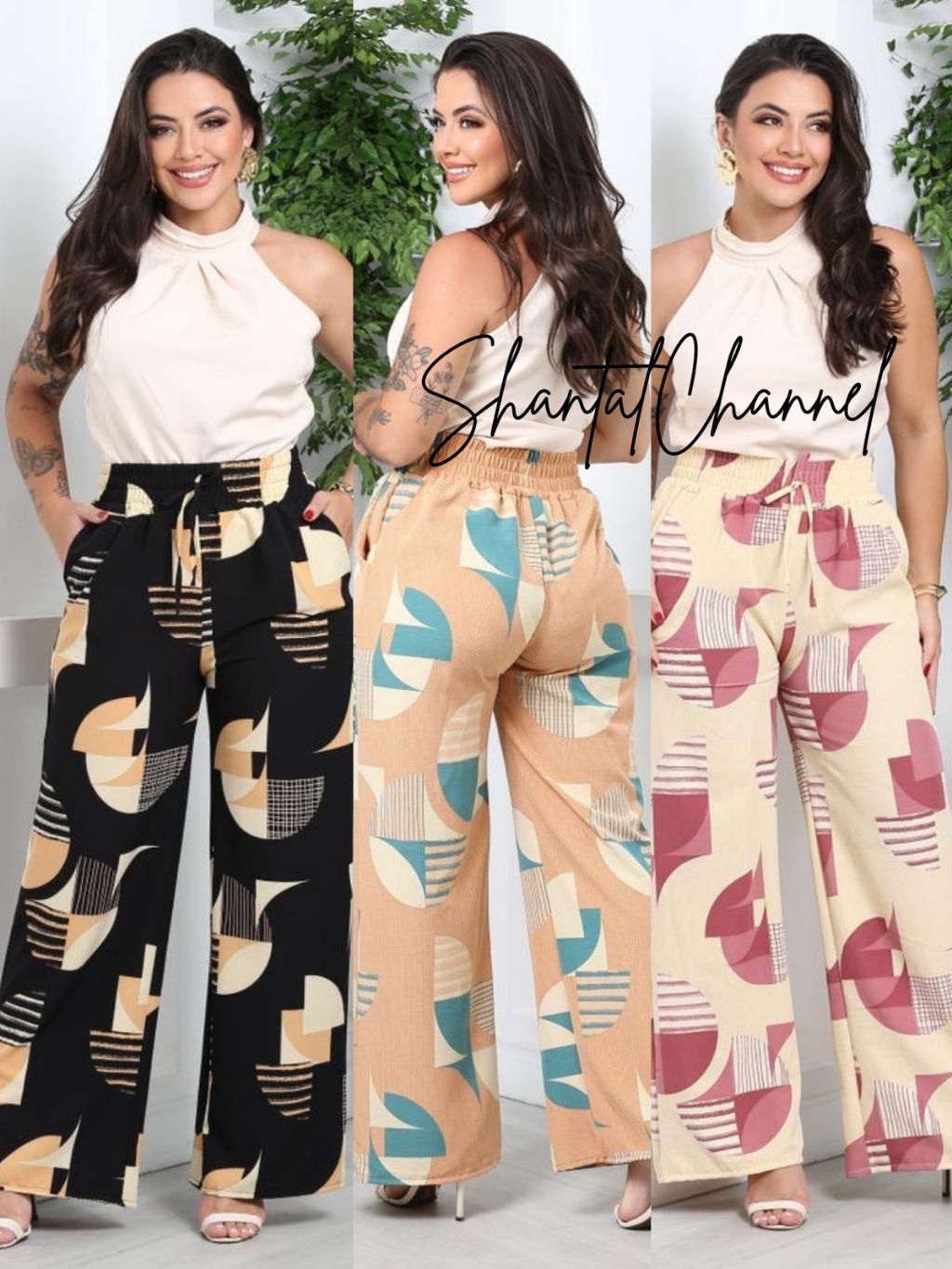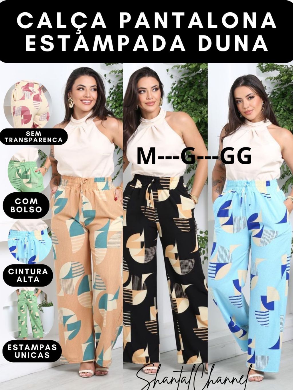 Calça Pantalona Feminina Estampada Cintura Alta Com Bolso Sem Transparência Duna PRONTA ENTREGA