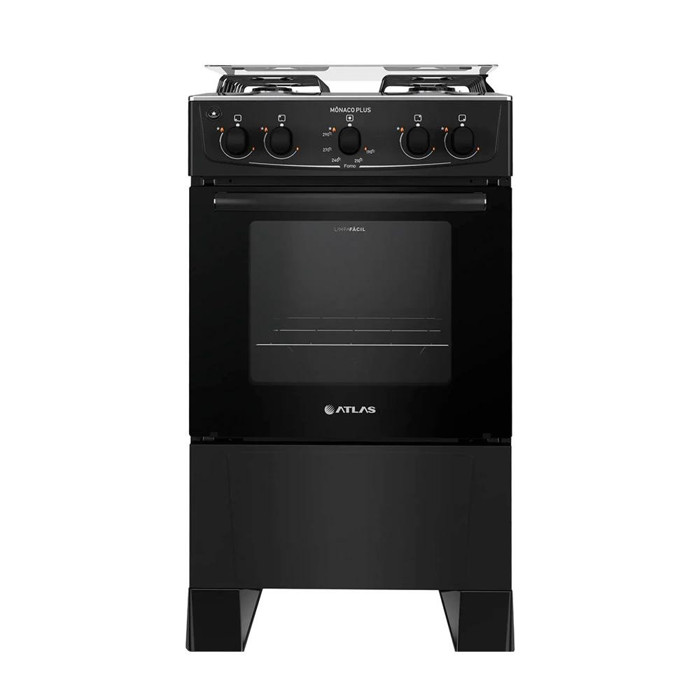 Fogão Atlas Mônaco Plus Preto 4 Bocas Mesa Inox Limpa Fácil Acendimento Automático Forno Robusto Design