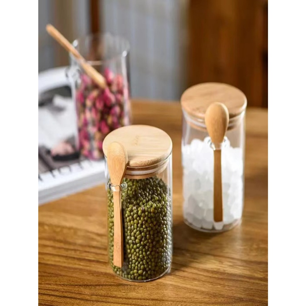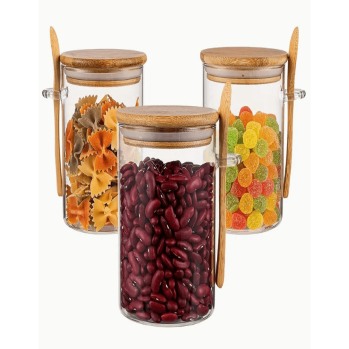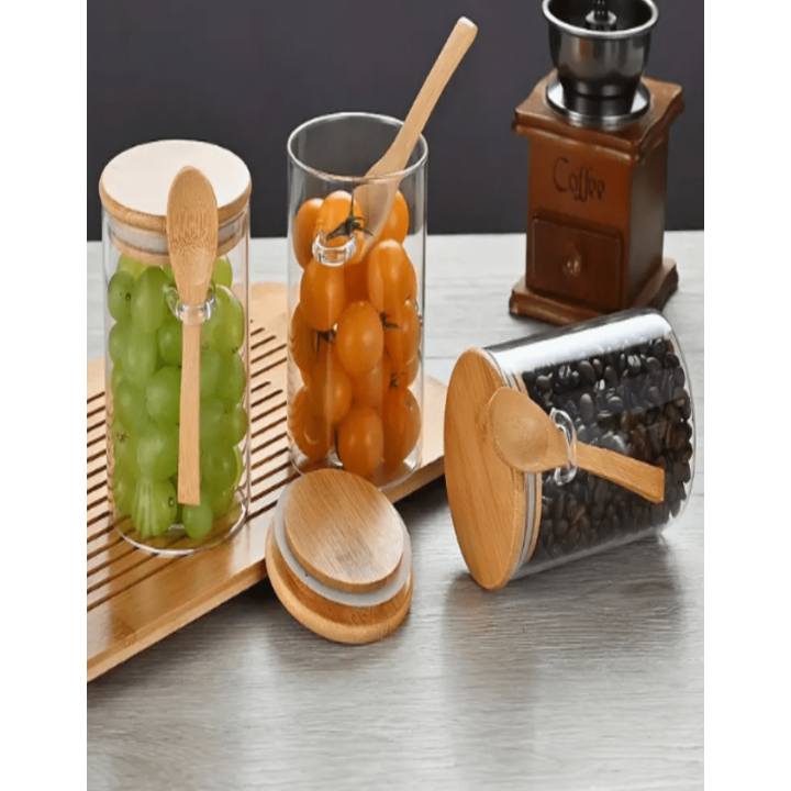 Kit 3 Pote De Vidro Hermético Tampa De Bambu 400ml Com Colher De Bambu