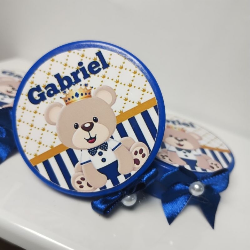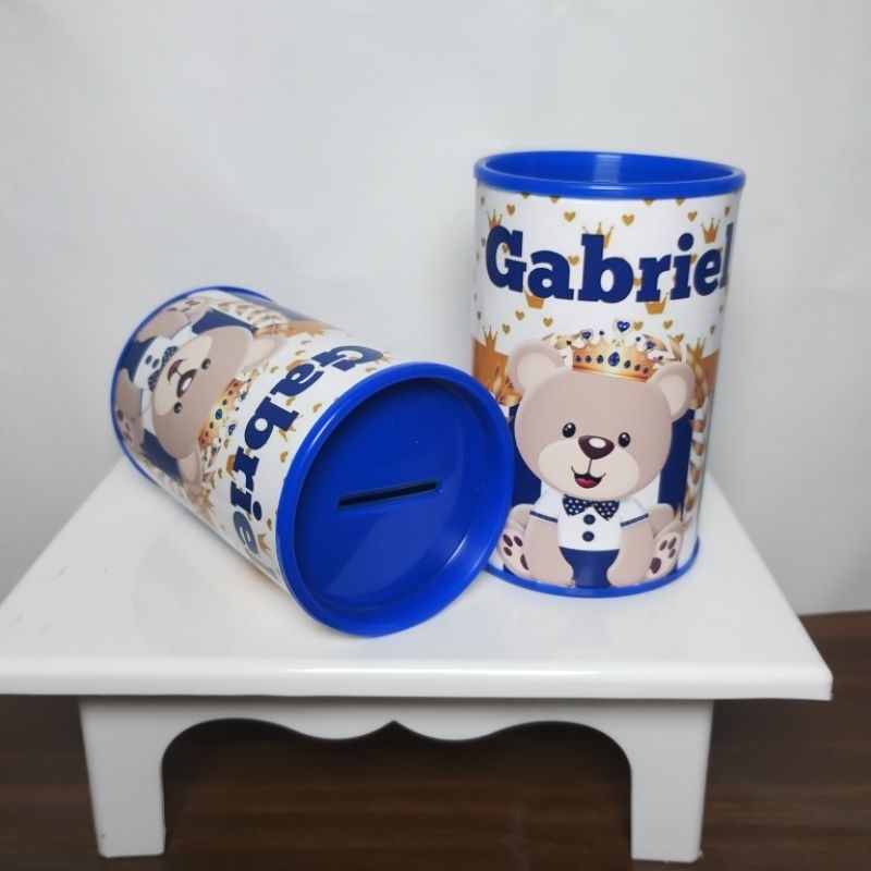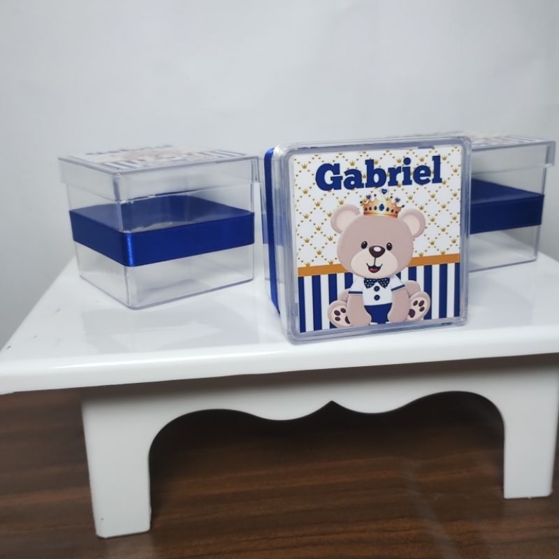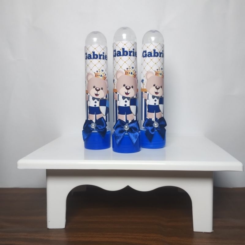 kit lembrancinhas ursinho príncipe, tubetes latinhas garrafinhas cofrinhos e caixa acrílica