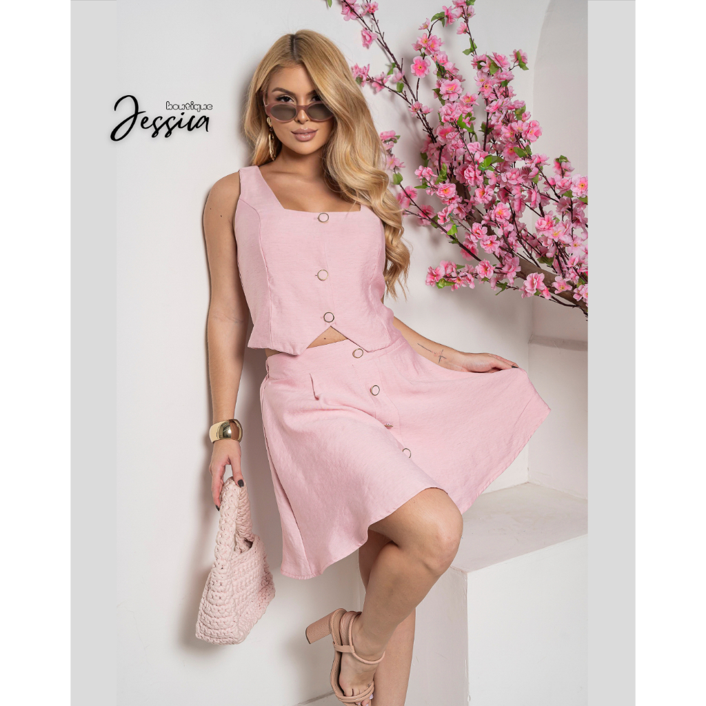 CONJUNTO FEMININA COLETE E SAIA SHORT linho algodão