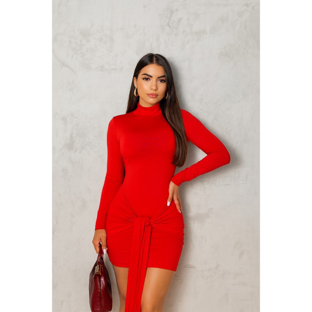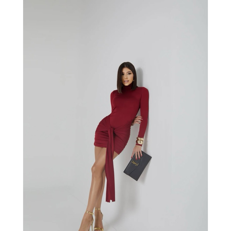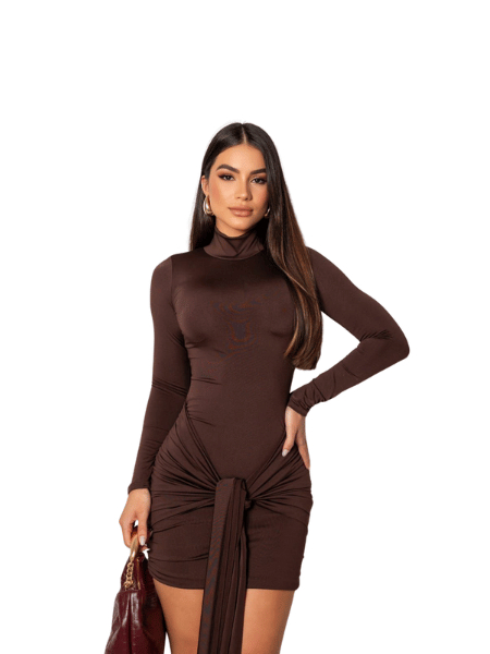 Vestido Moda Blogueira Feminino Gola Alta Manga Longa Suplex com Detalhe no Quadril