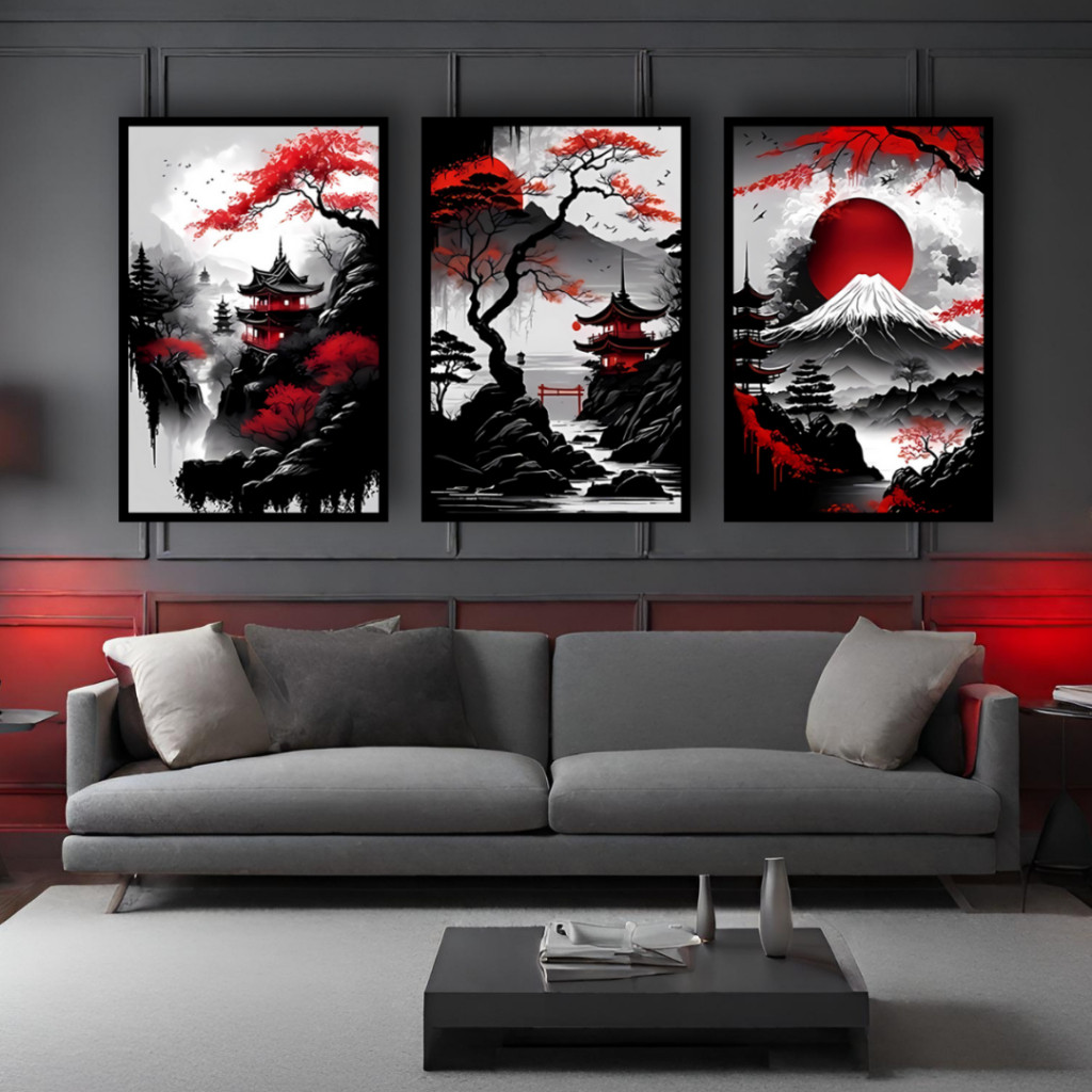 KIT 3 Quadros Decorativos Arte Oriental Moderna Estilo Japonês Sala de Estar Quarto Decoração de Parede