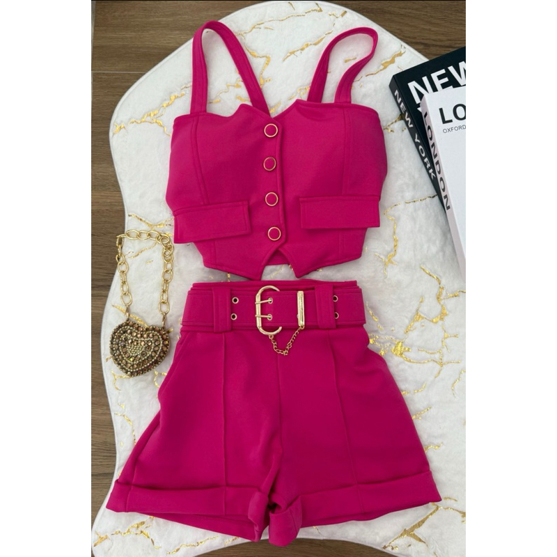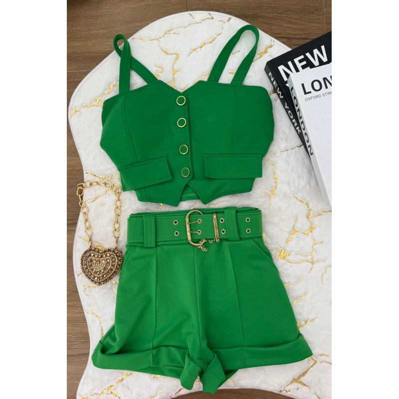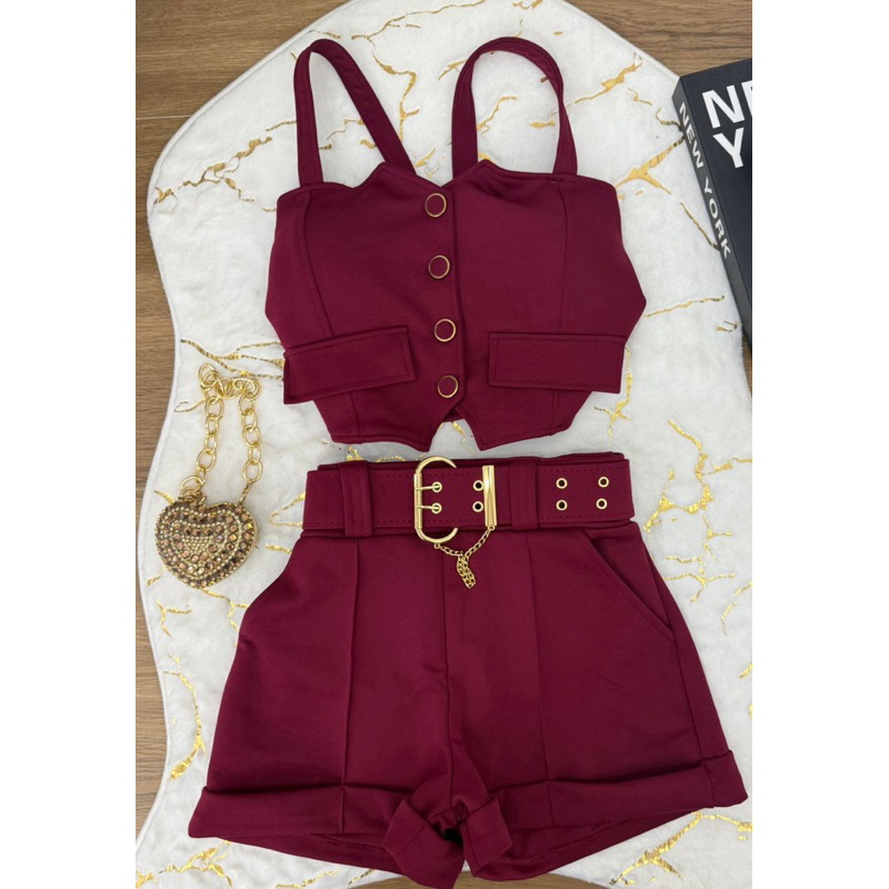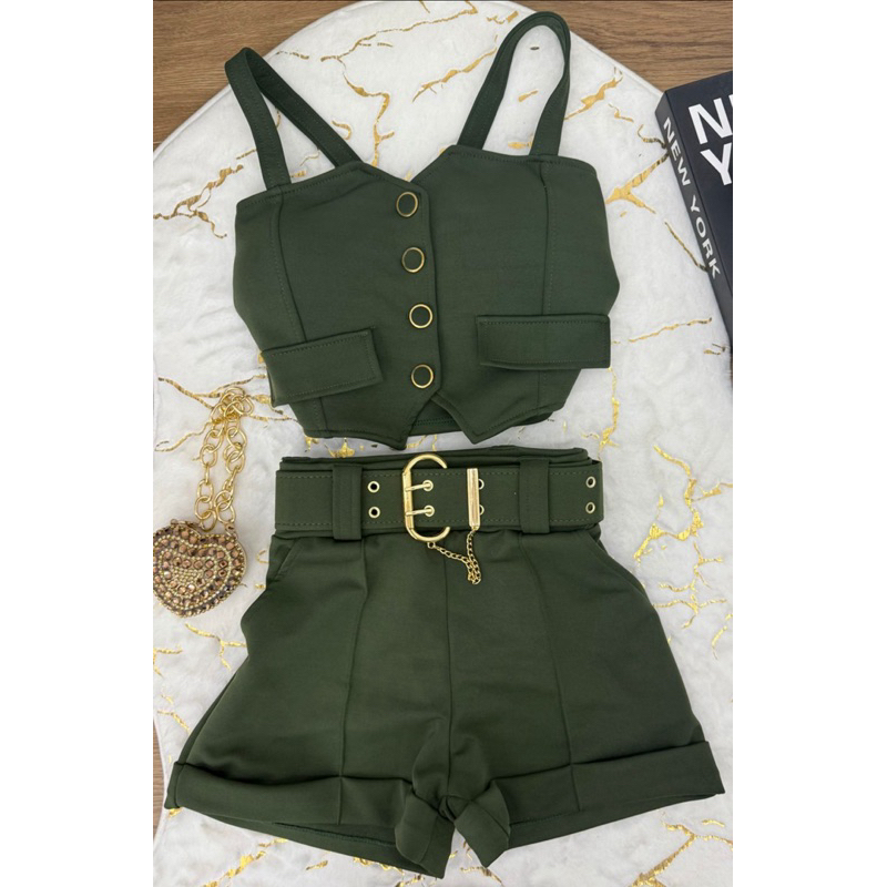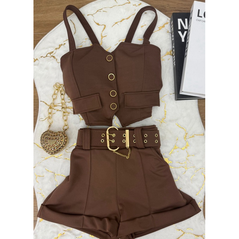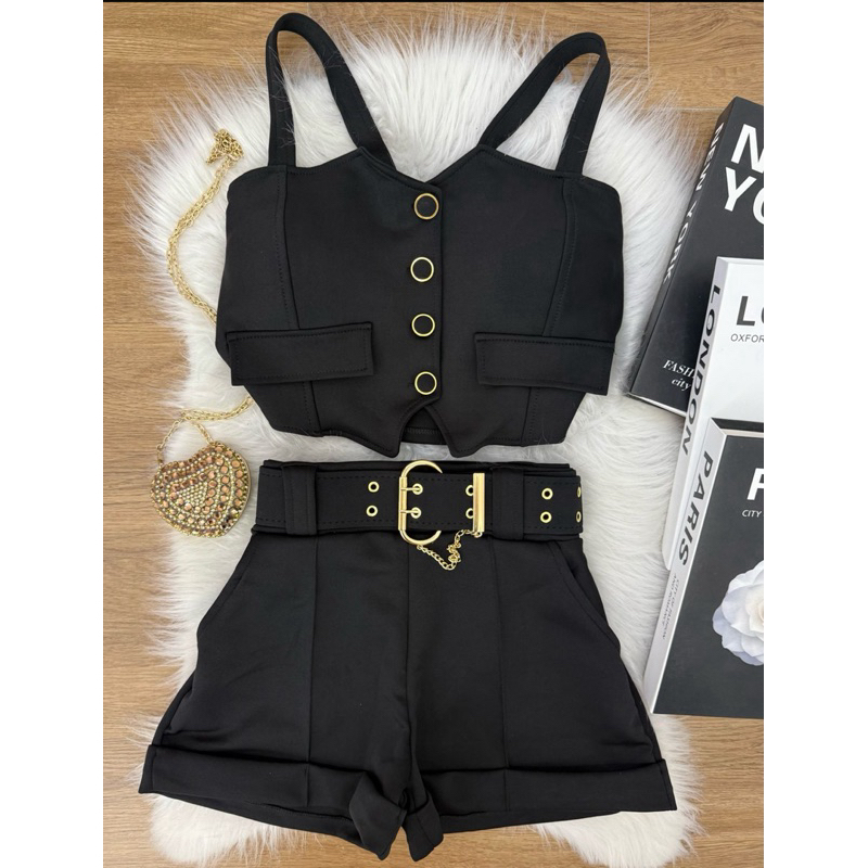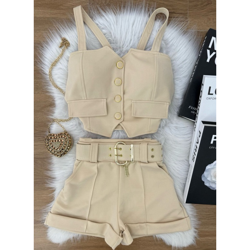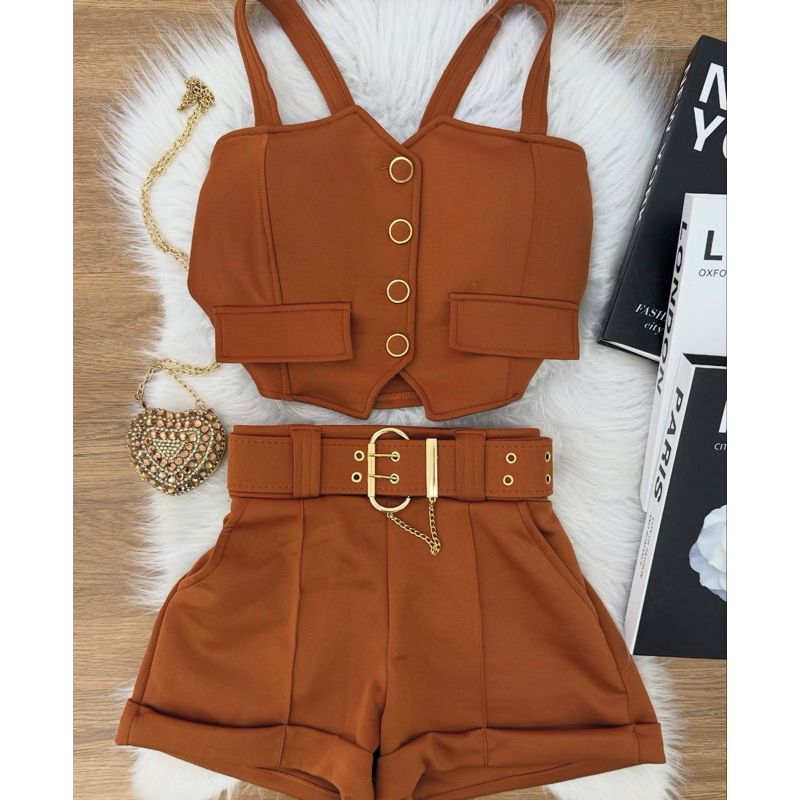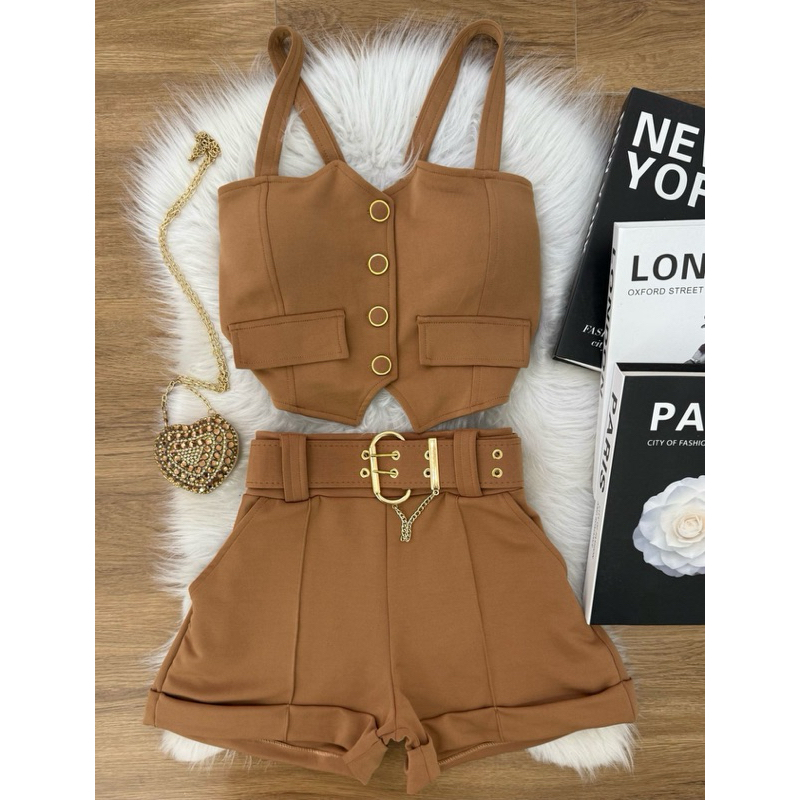 conjunto cropped de botão com alças short com cinto neoprene