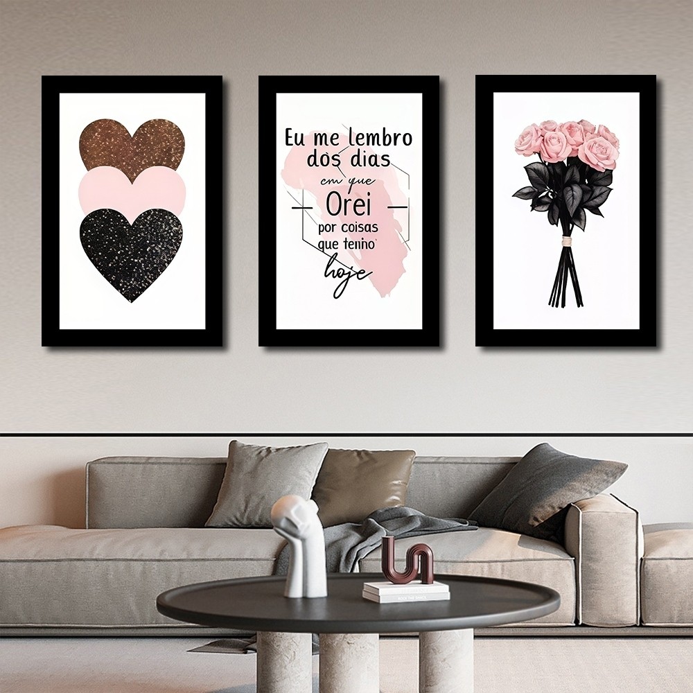 Kit 3 Quadros Decorativos Sala, Quarto, Escritório Decoração Flores, eu me lembro oração, coração rosa