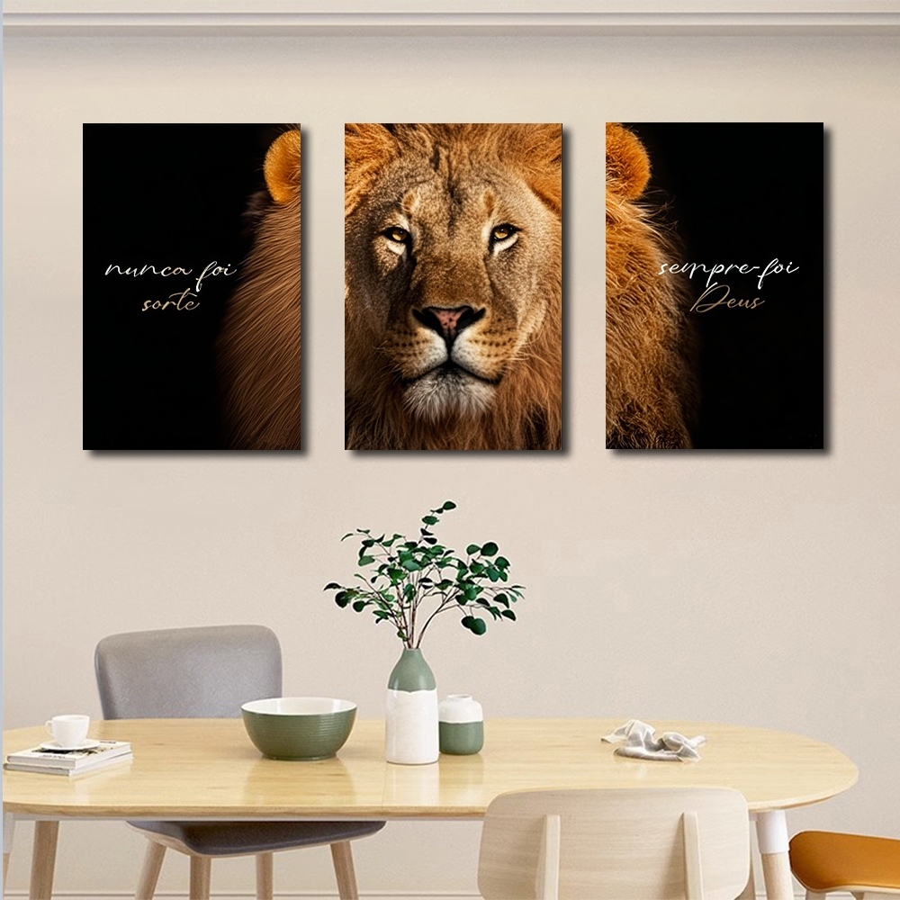 Kit 3 Quadros Decorativos MDF Leão Nunca Foi Sorte/Sempre Foi Deus Sala Quarto Escritório
