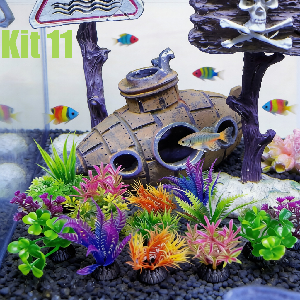 Kit Aquário: Submarino Decorativo +10 Plantas Artificiais | Casa p/ Peixes Beta e Decoração Completa