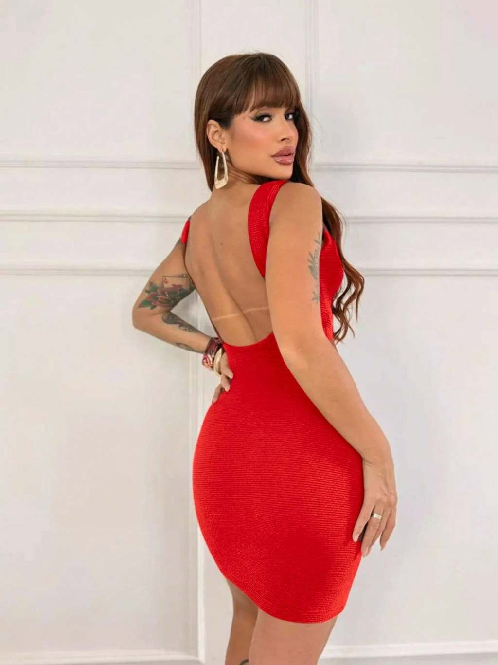 Vestido Curto Justo Canelado com Decote nas Costas Tendencia Natal Ano Novo