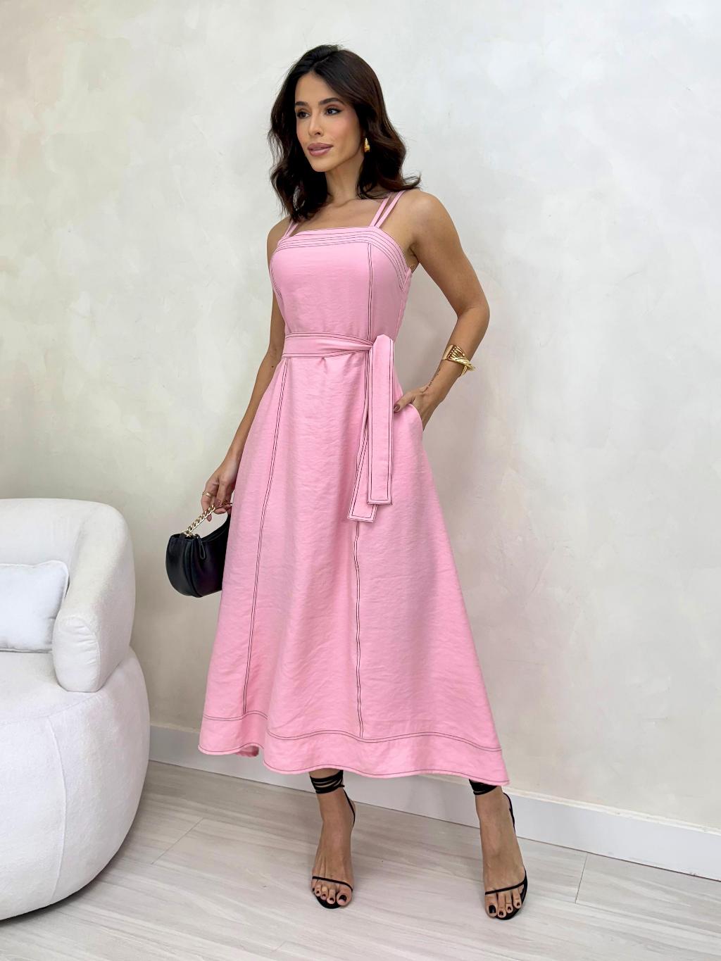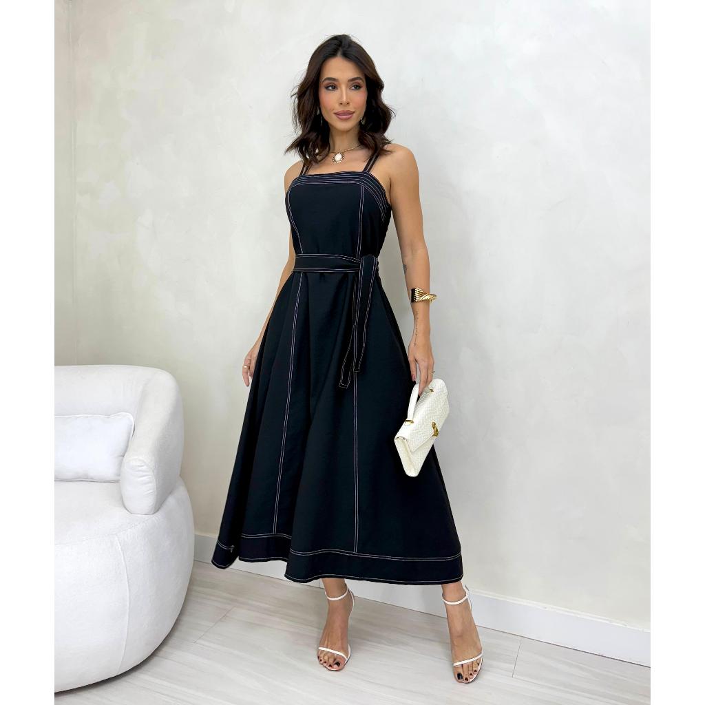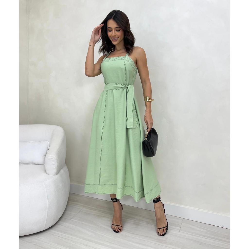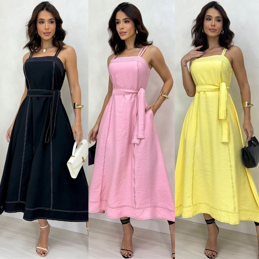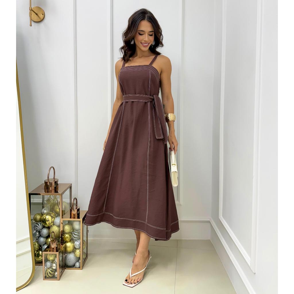 VESTIDO MIDI FEMININO Com CINTO FAIXA e BOLSOS - MODA ELEGANTE