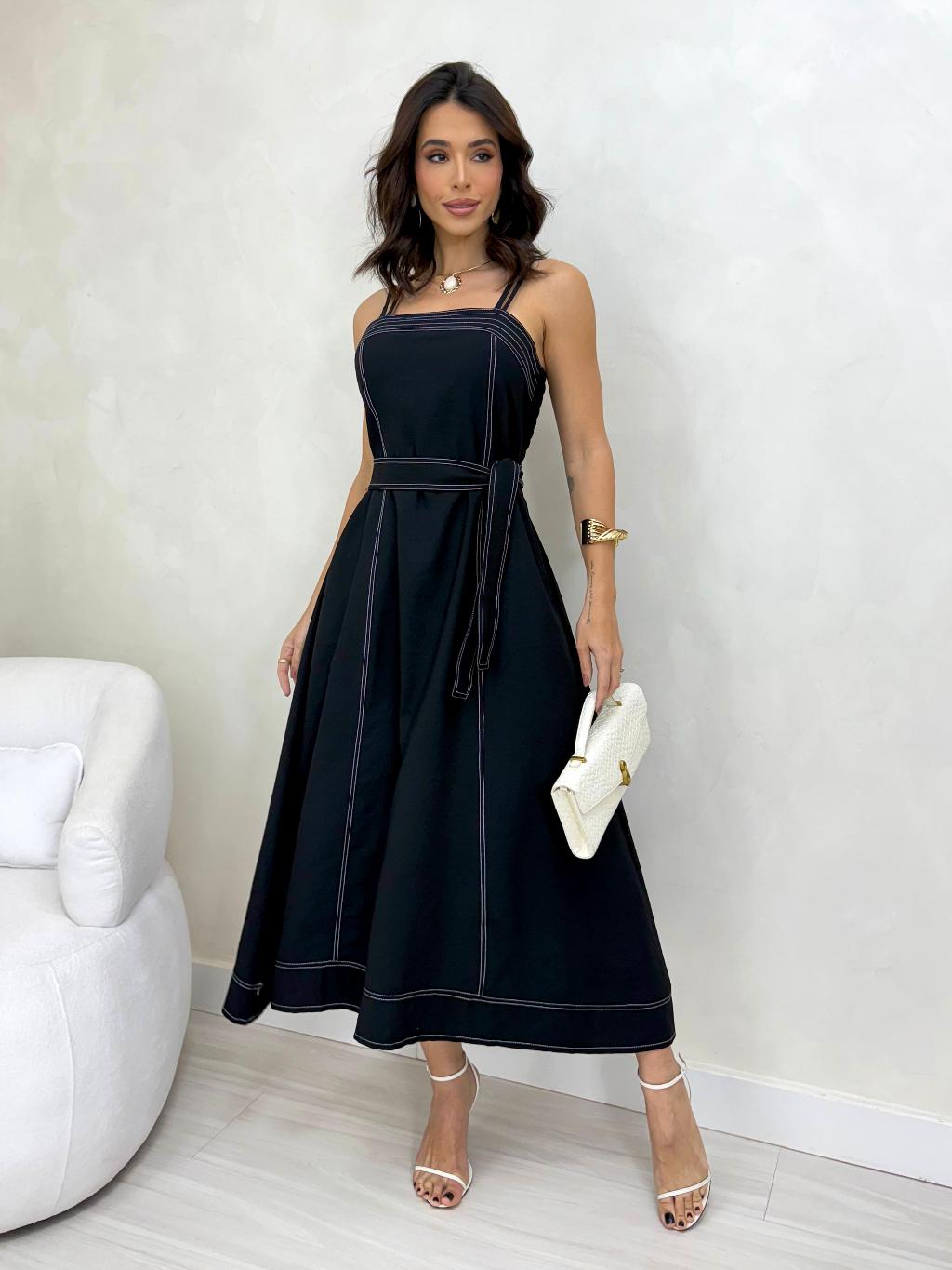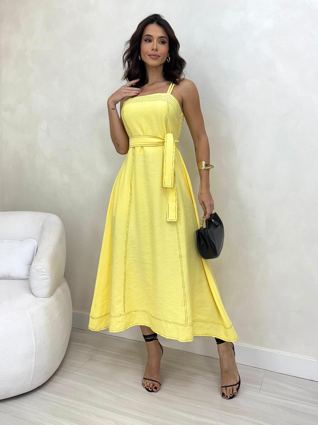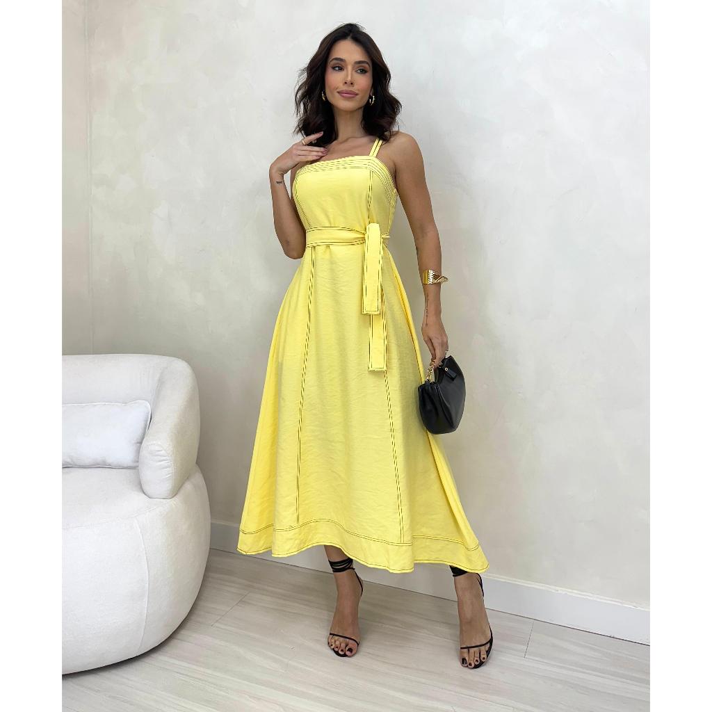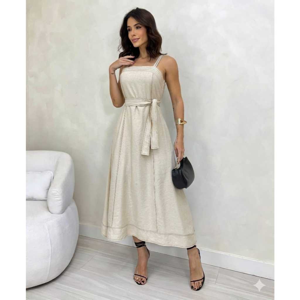 VESTIDO MIDI FEMININO Com CINTO FAIXA e BOLSOS - MODA ELEGANTE