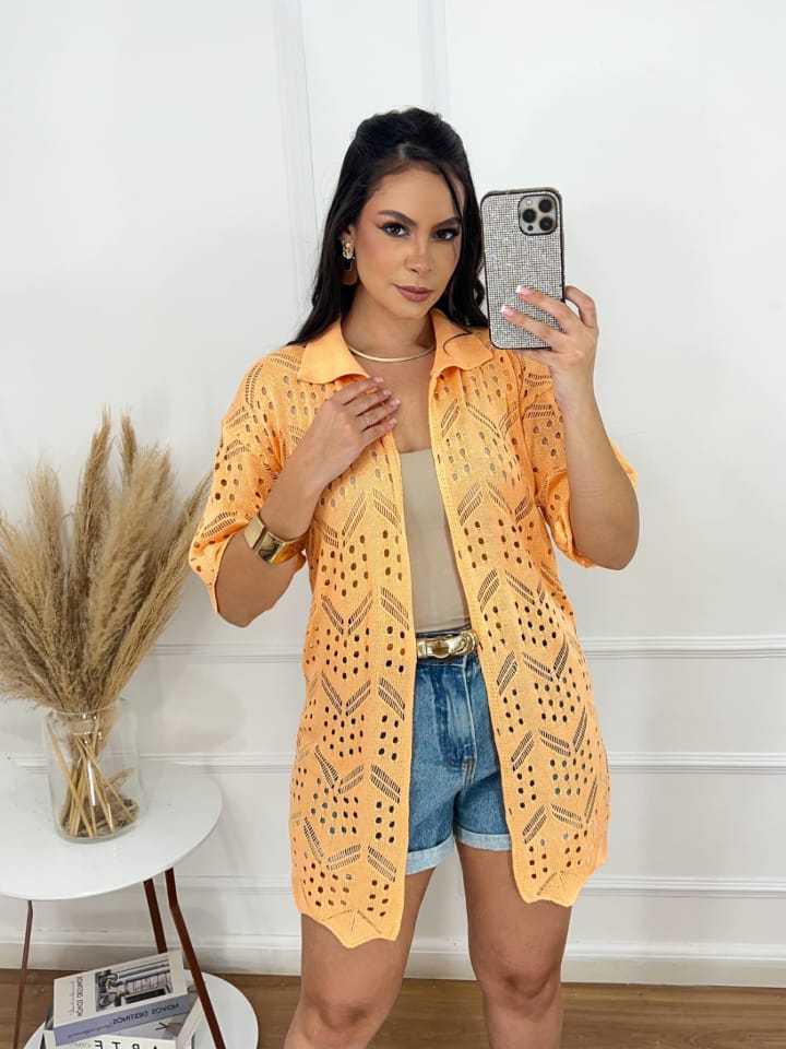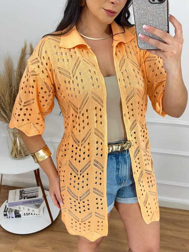 Camisa Feminina Saída de Praia Tricô Rendada Crochê Gola Polo Chamise Verão Lançamento
