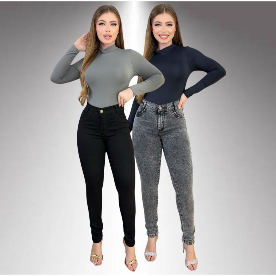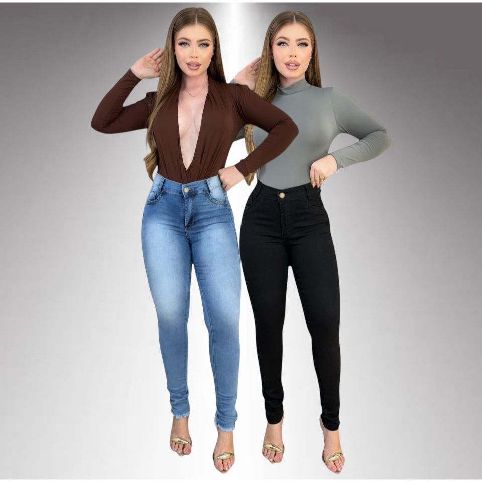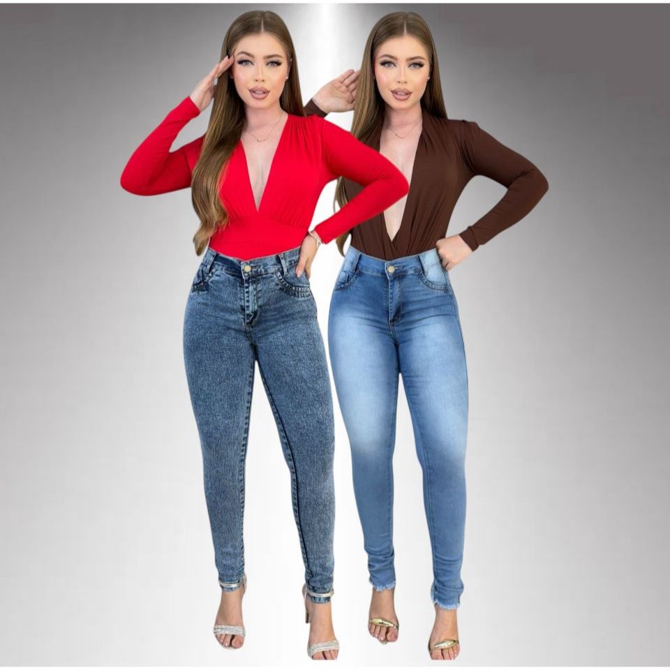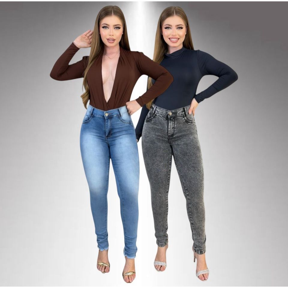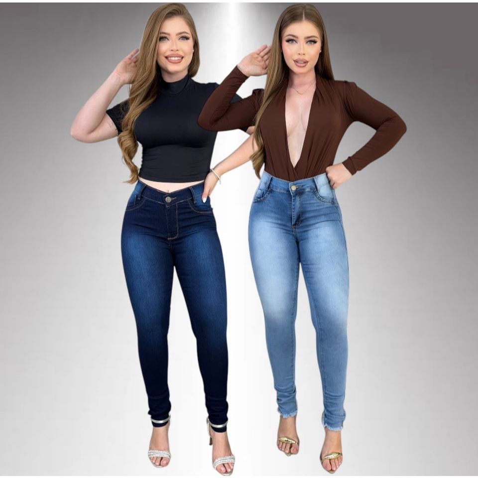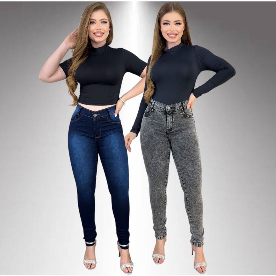 Kit 2 Calças Jeans Feminina Skinny Lycra Cintura Alta Modelo Empina Bumbum Lançamento Promoção