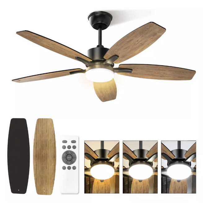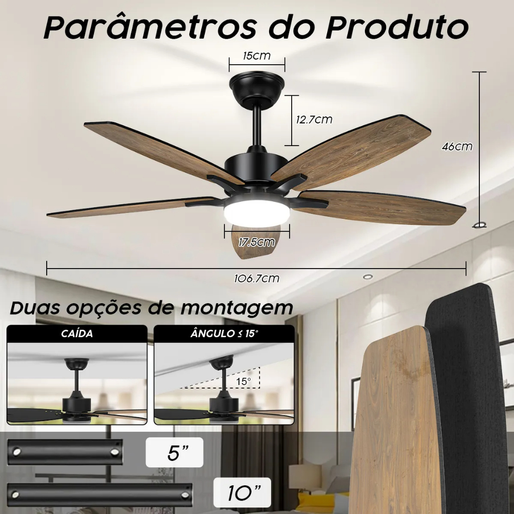 Ventilador de teto com luz LED e controle remoto de teto silencioso, motor DC reversível, 6 velocidades, bivolt110-220v