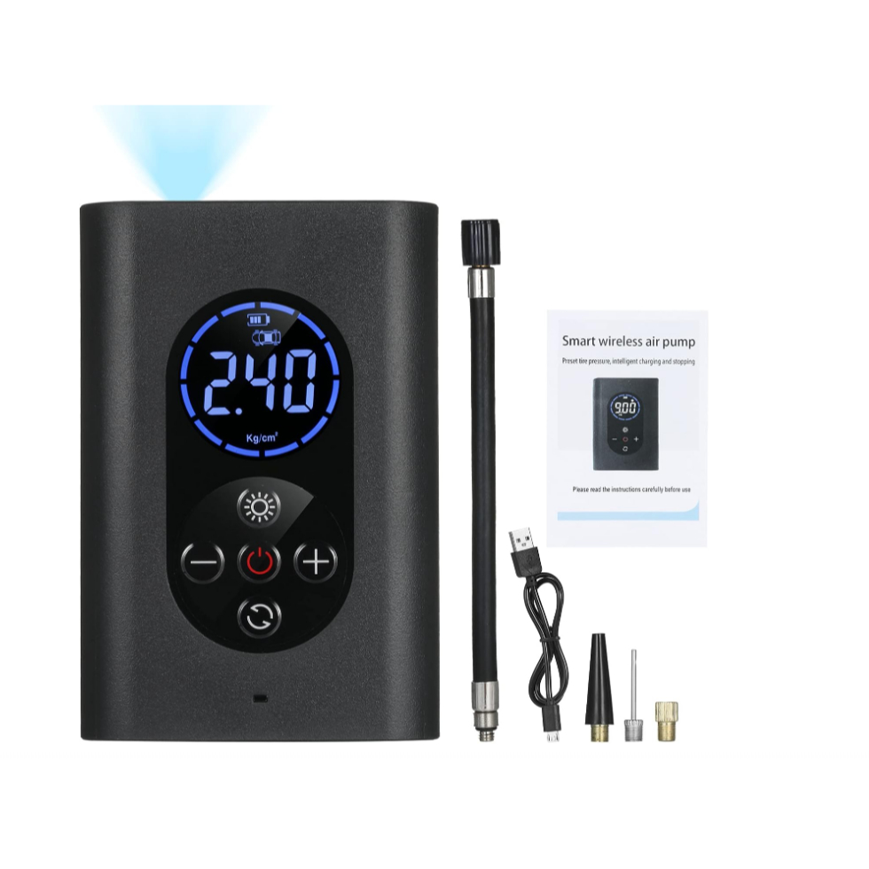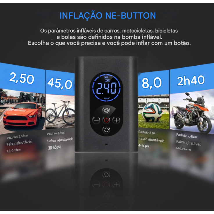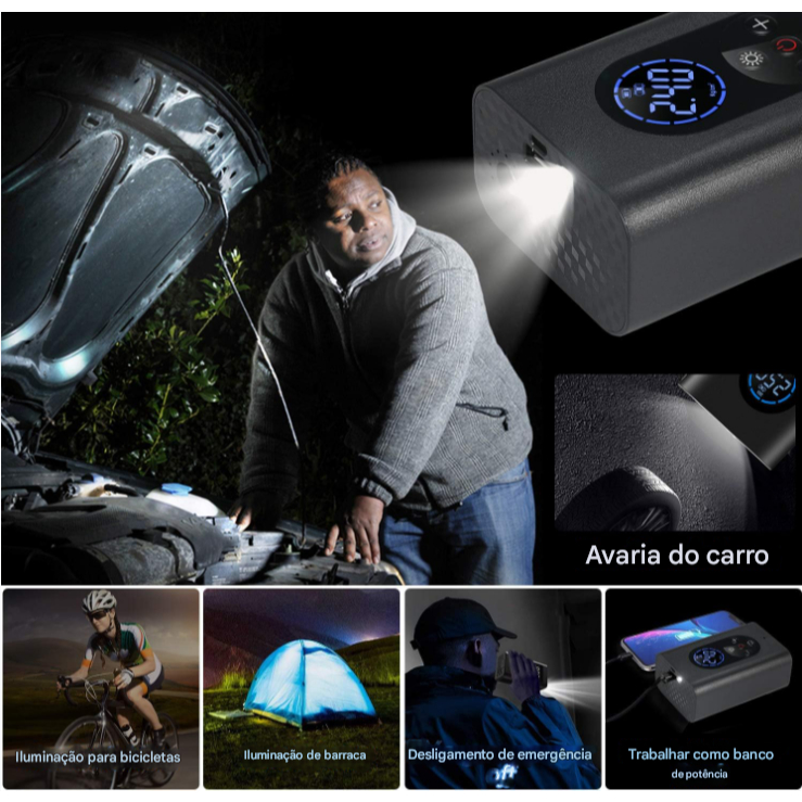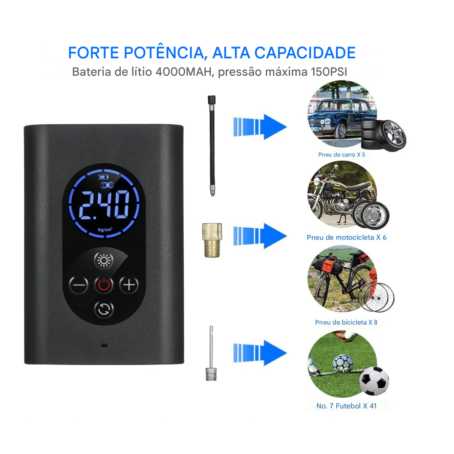 Inflador de Pneus Portátil 150 PSI com manômetro Luz LED 4000mAh USB Recarregável