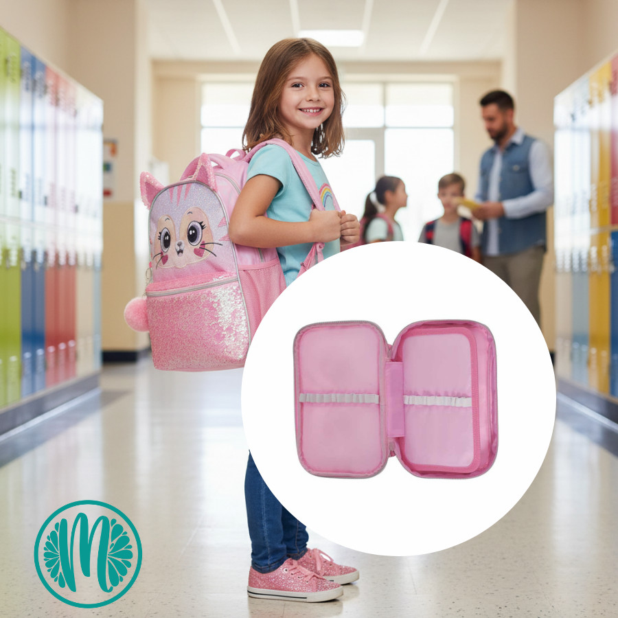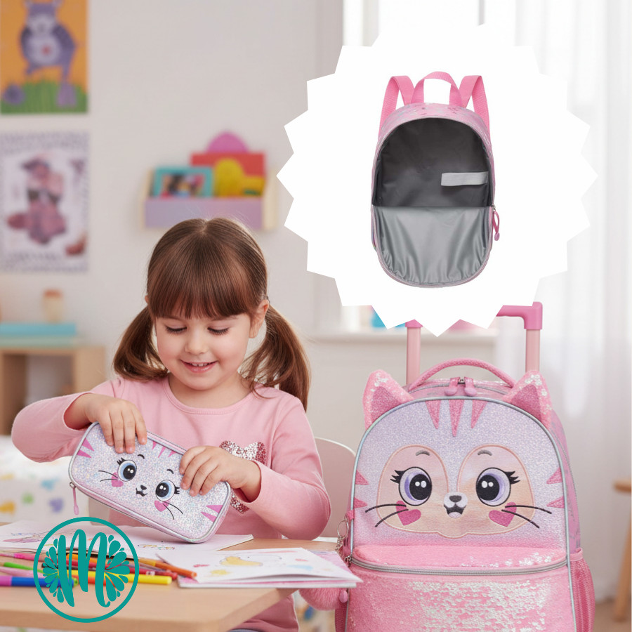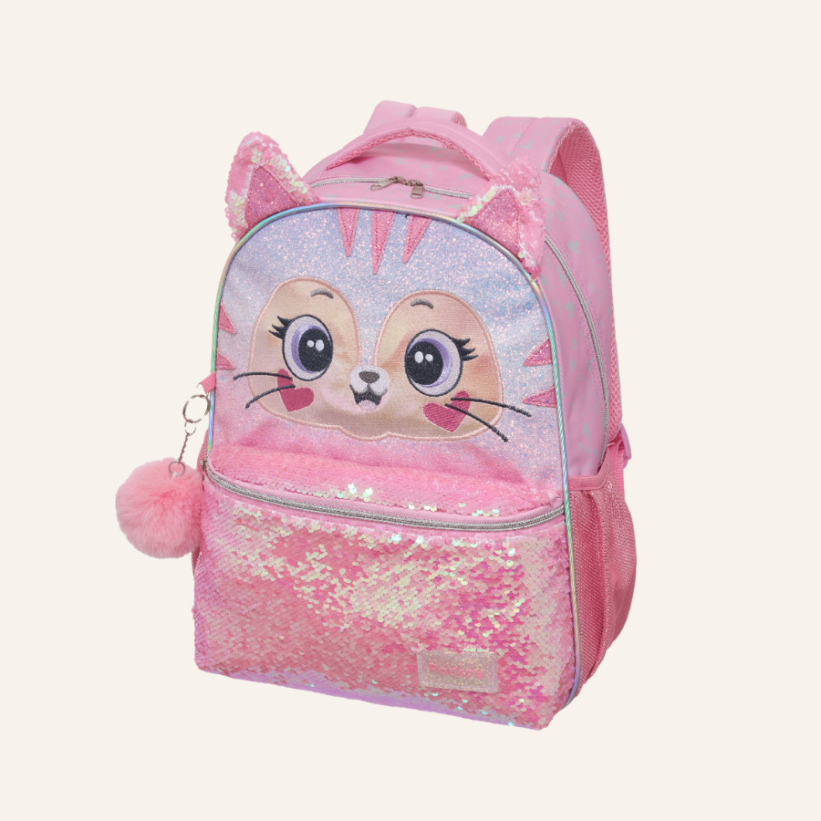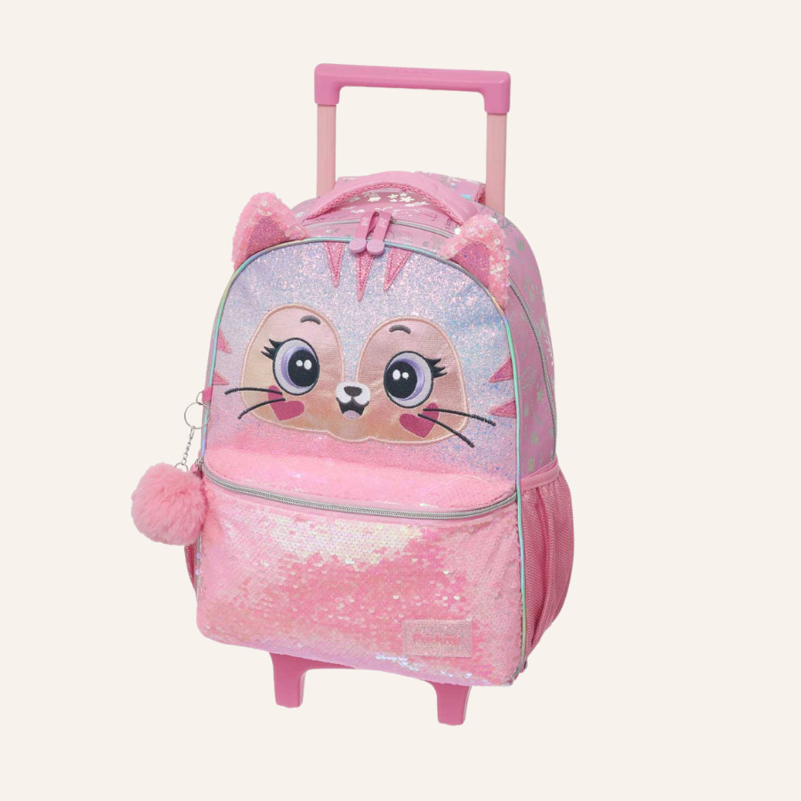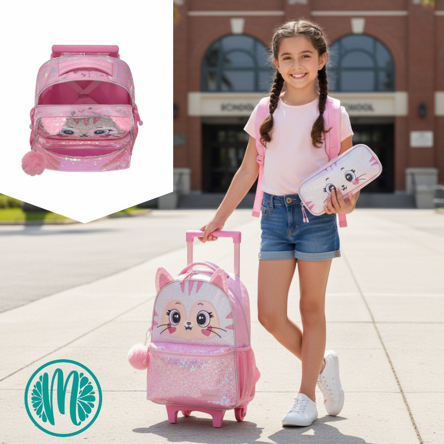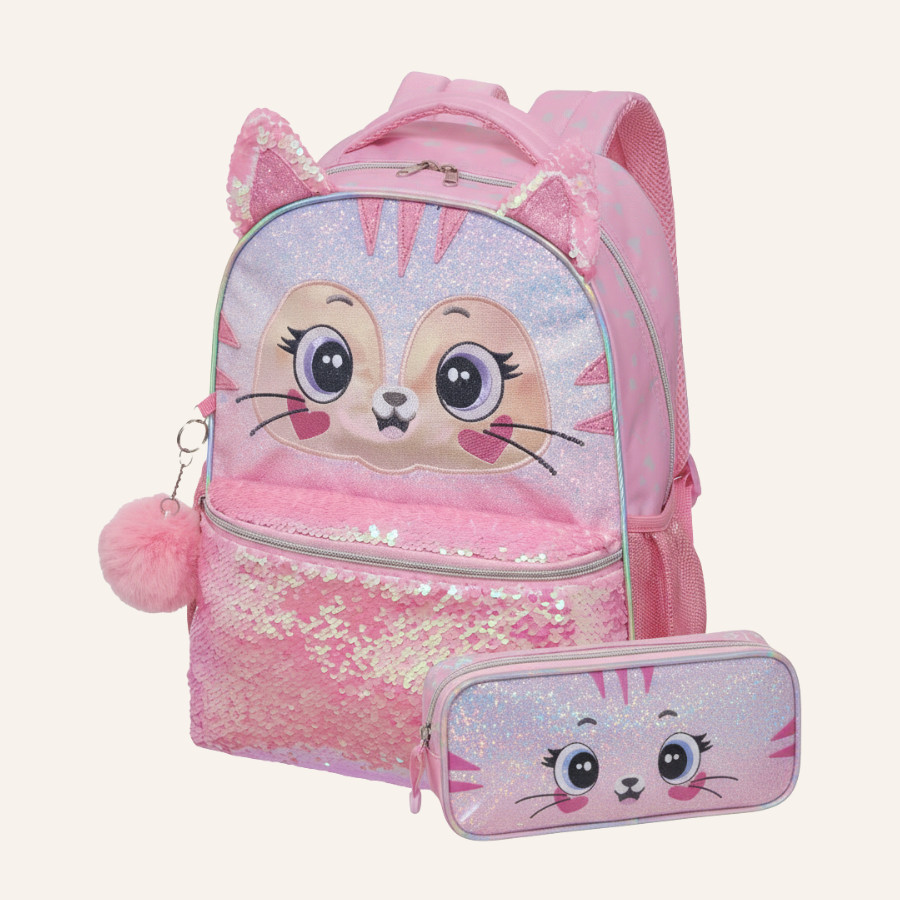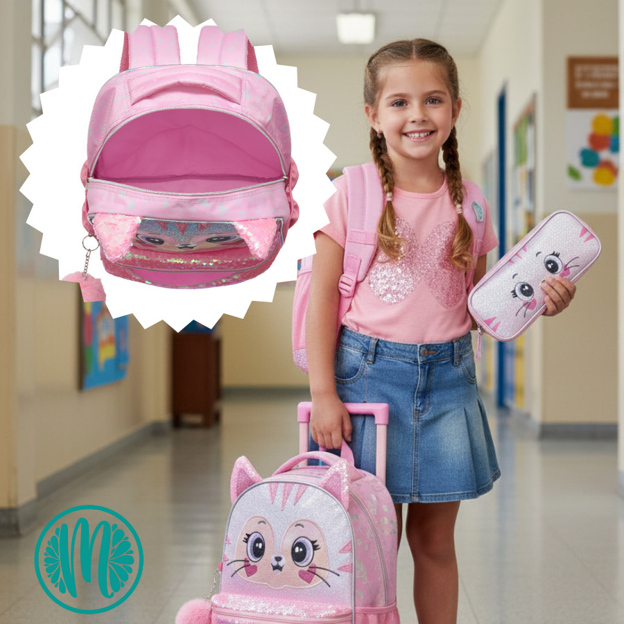 Mochila Rodinhas Costas e Estojo Kitten Gatinho Glitter Pacific