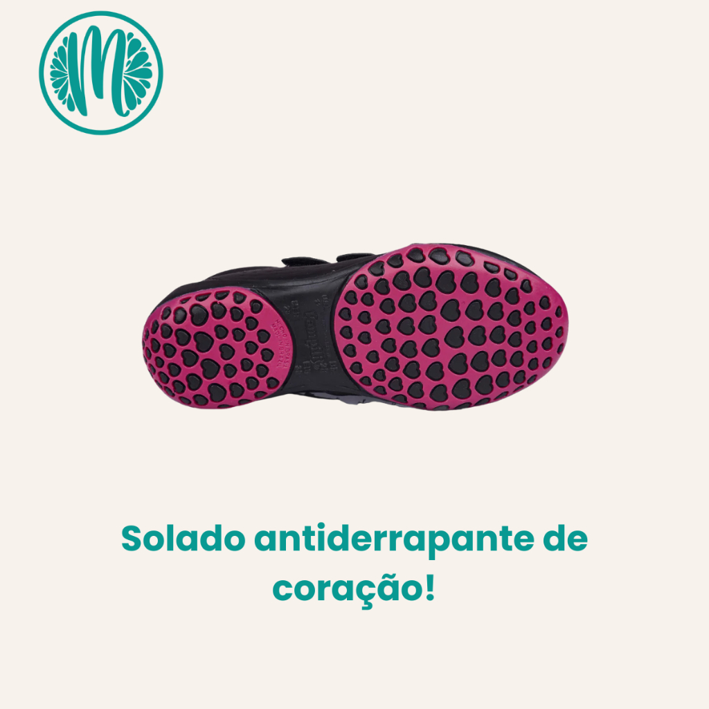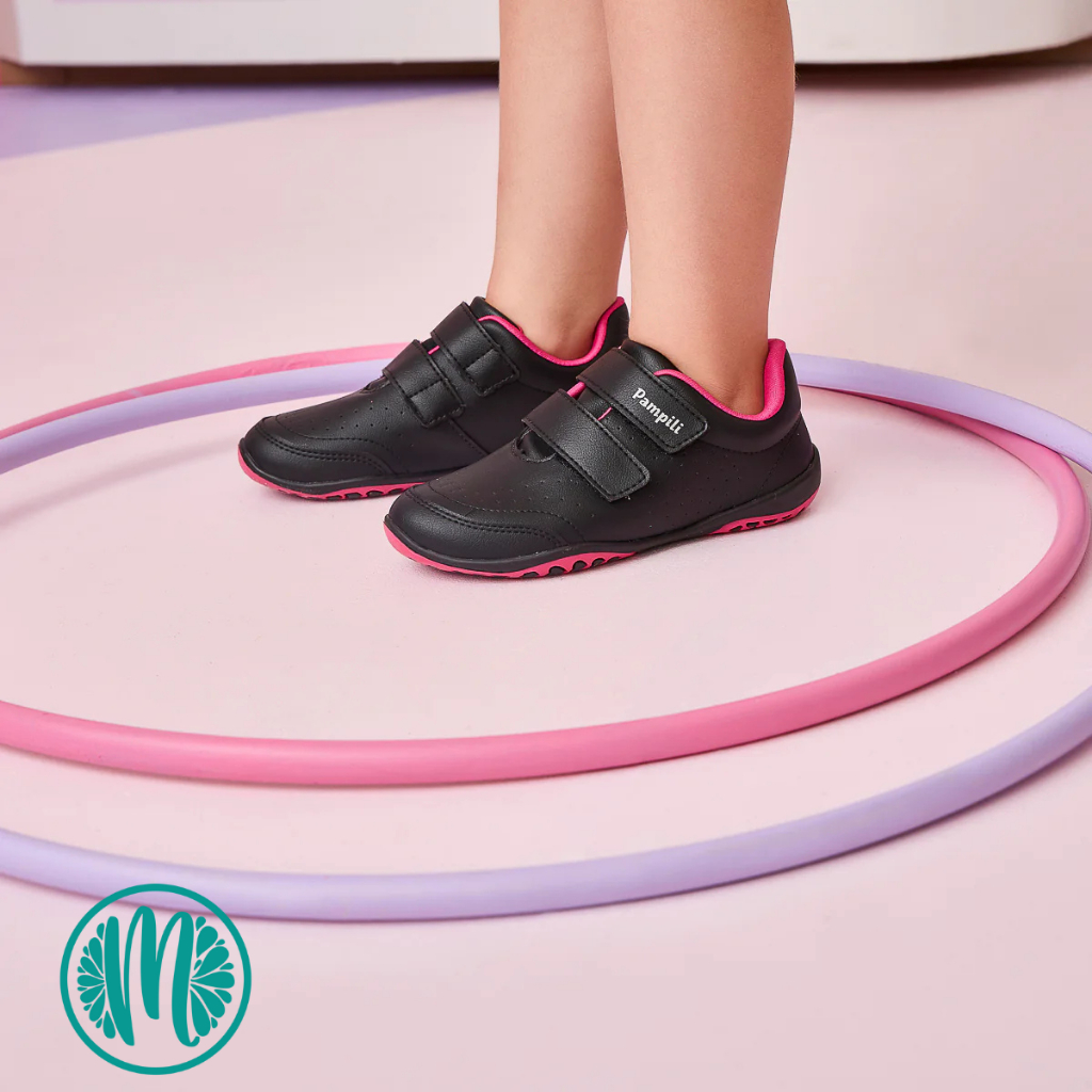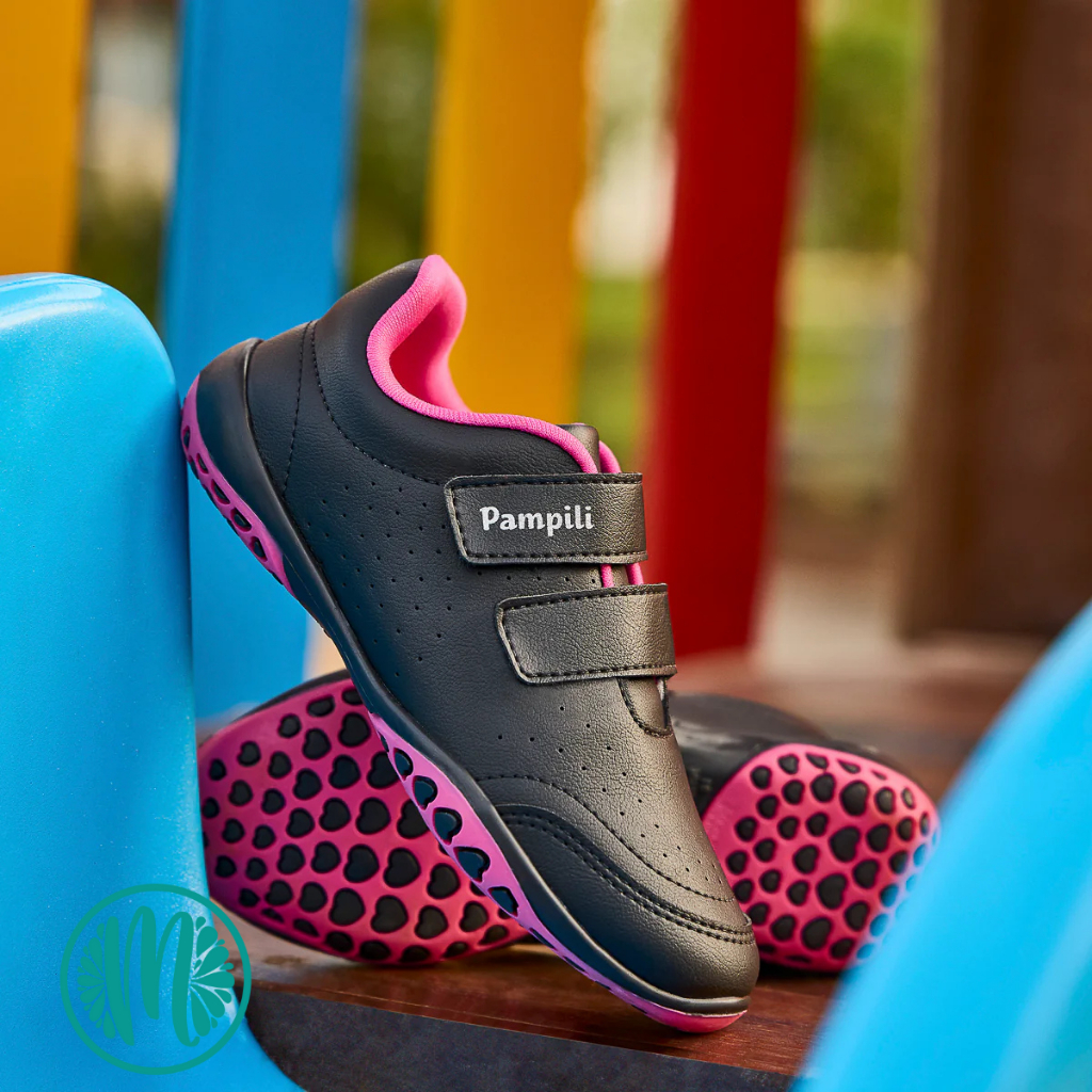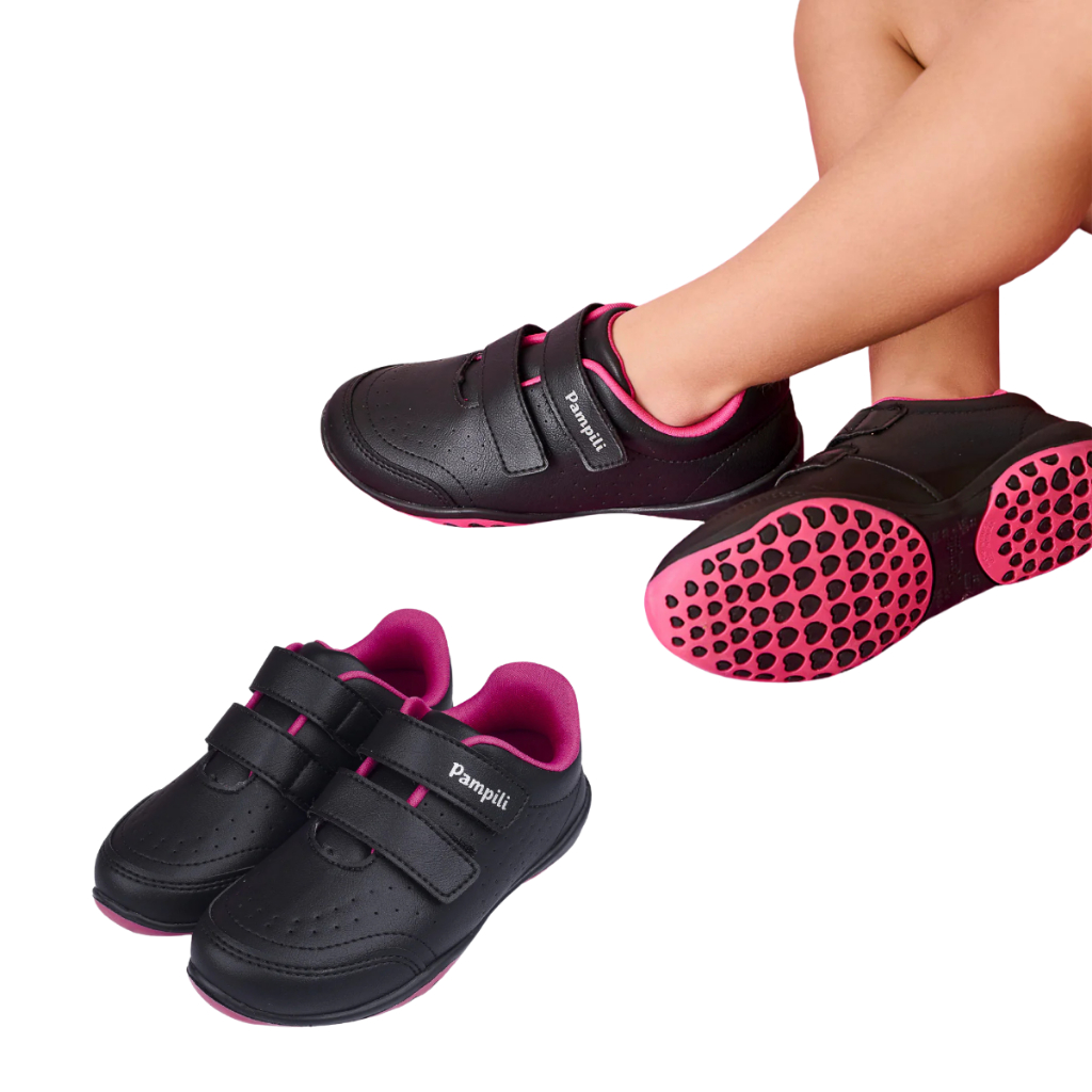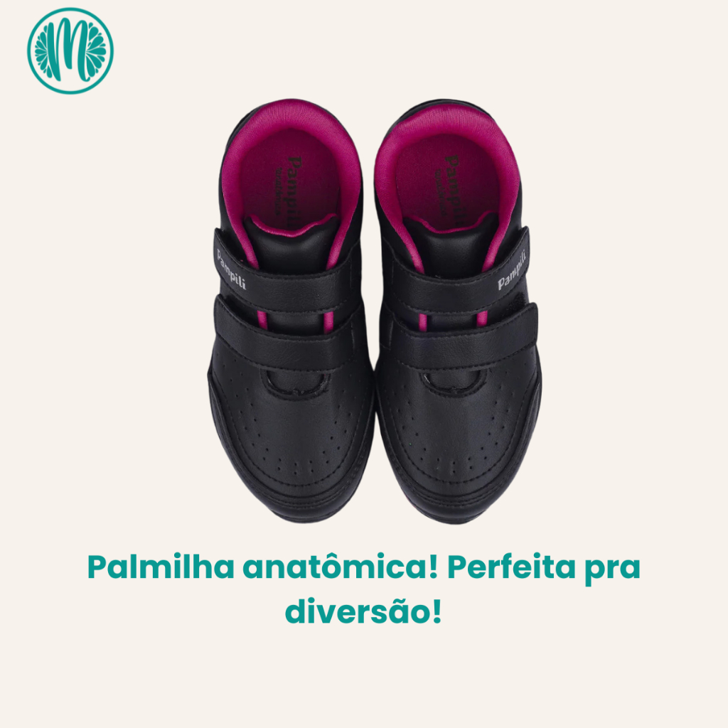 Tênis Escolar Pampili Honey Preto C/ Rosa Velcro Anatômico Coração