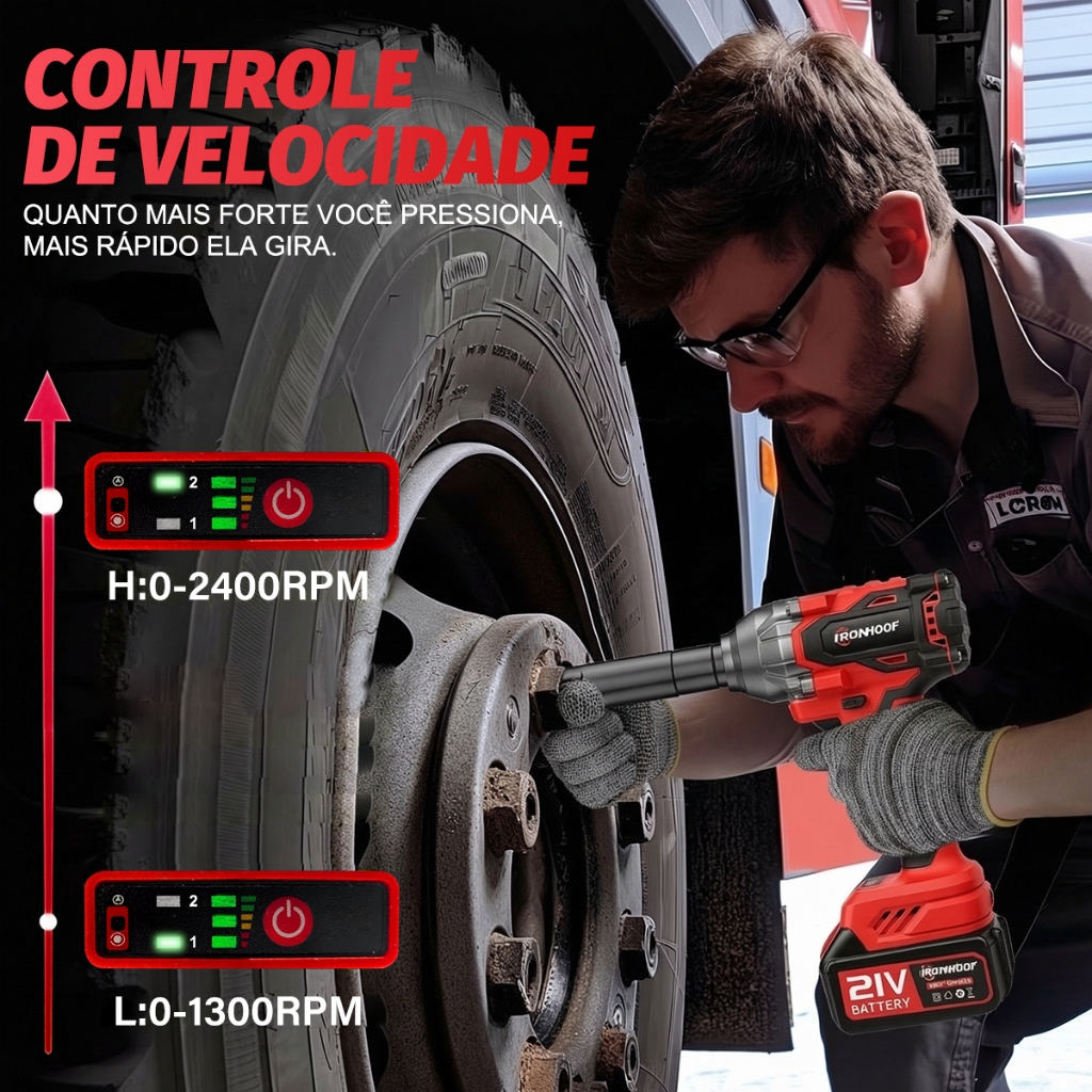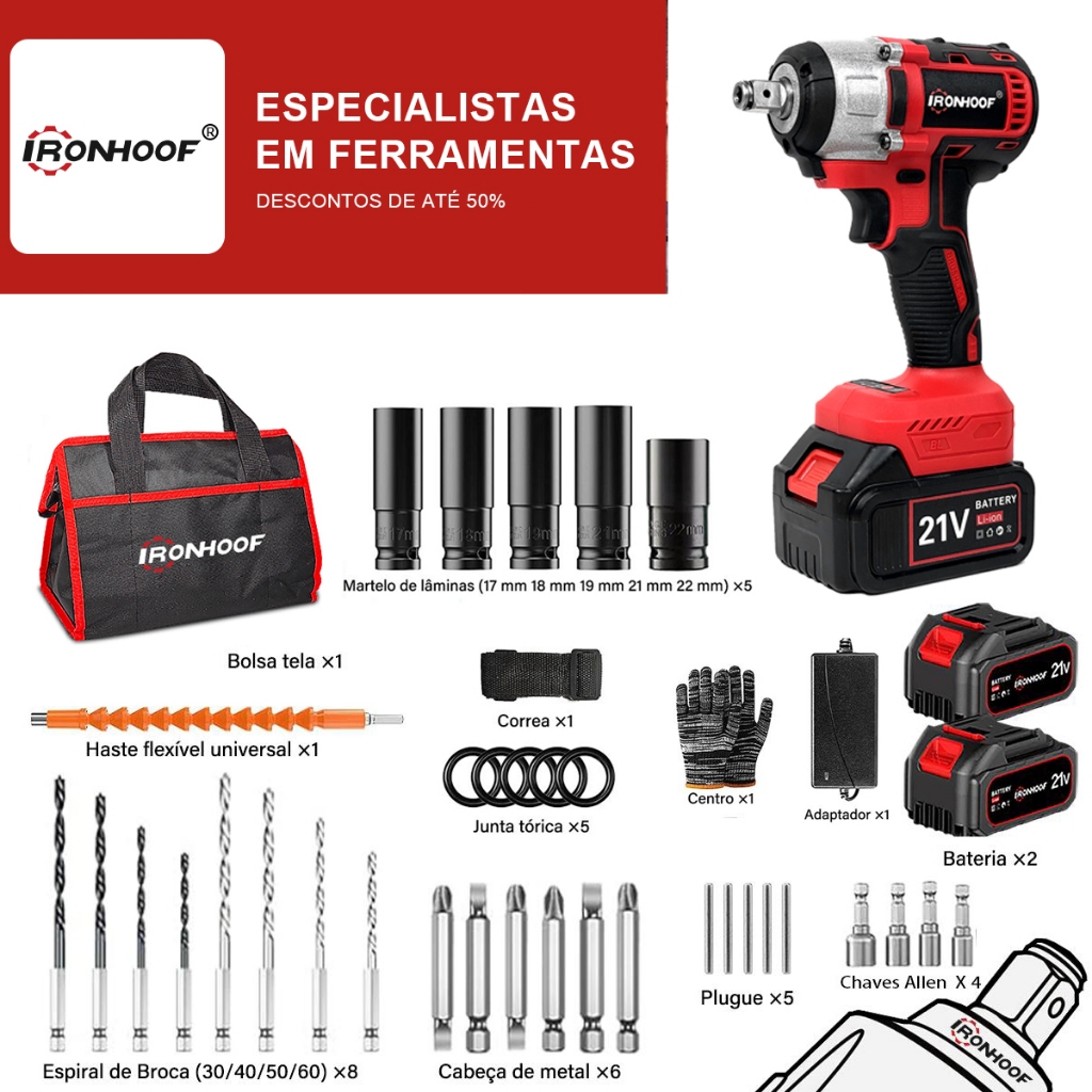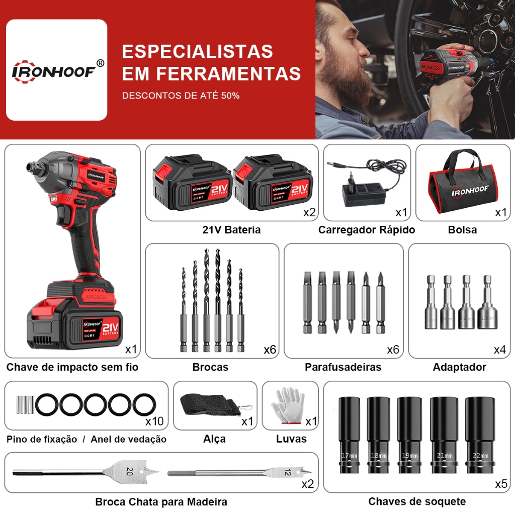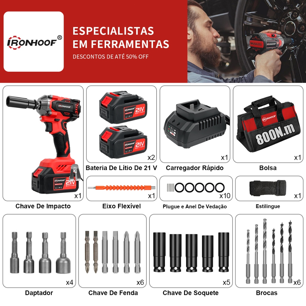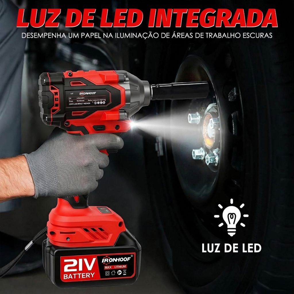 Chave de Impacto Potente 800/520Nm Parafusadeira Brushless Profissional 2 Bateria