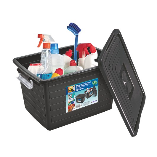 Caixa Organizadora Multiuso Preta C/ Tampa e Trava Prata 30L Arqplast