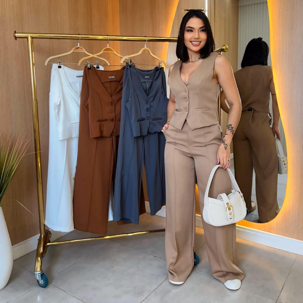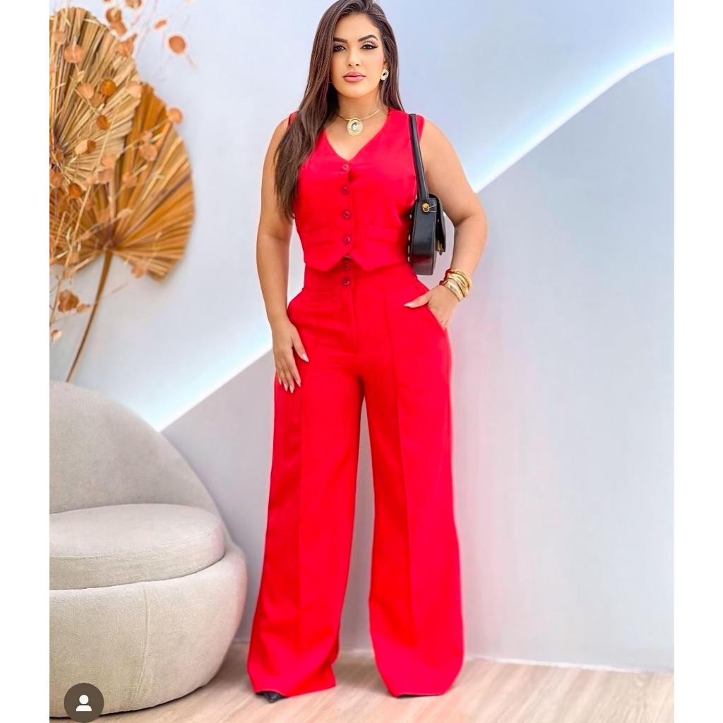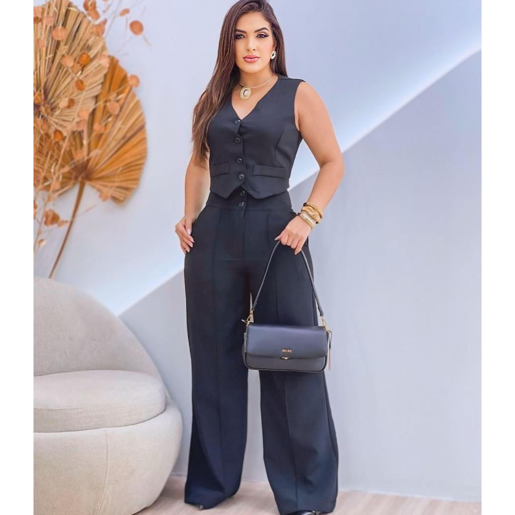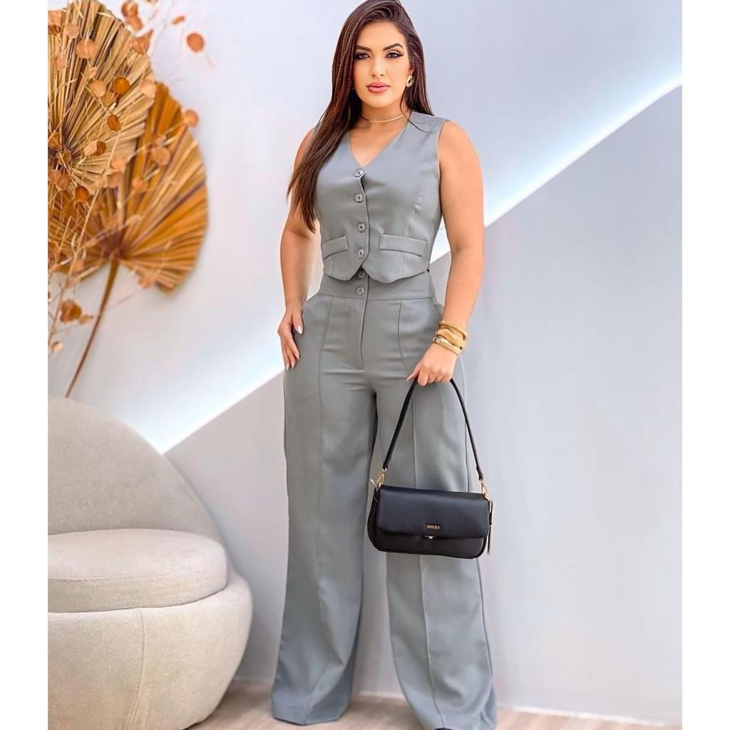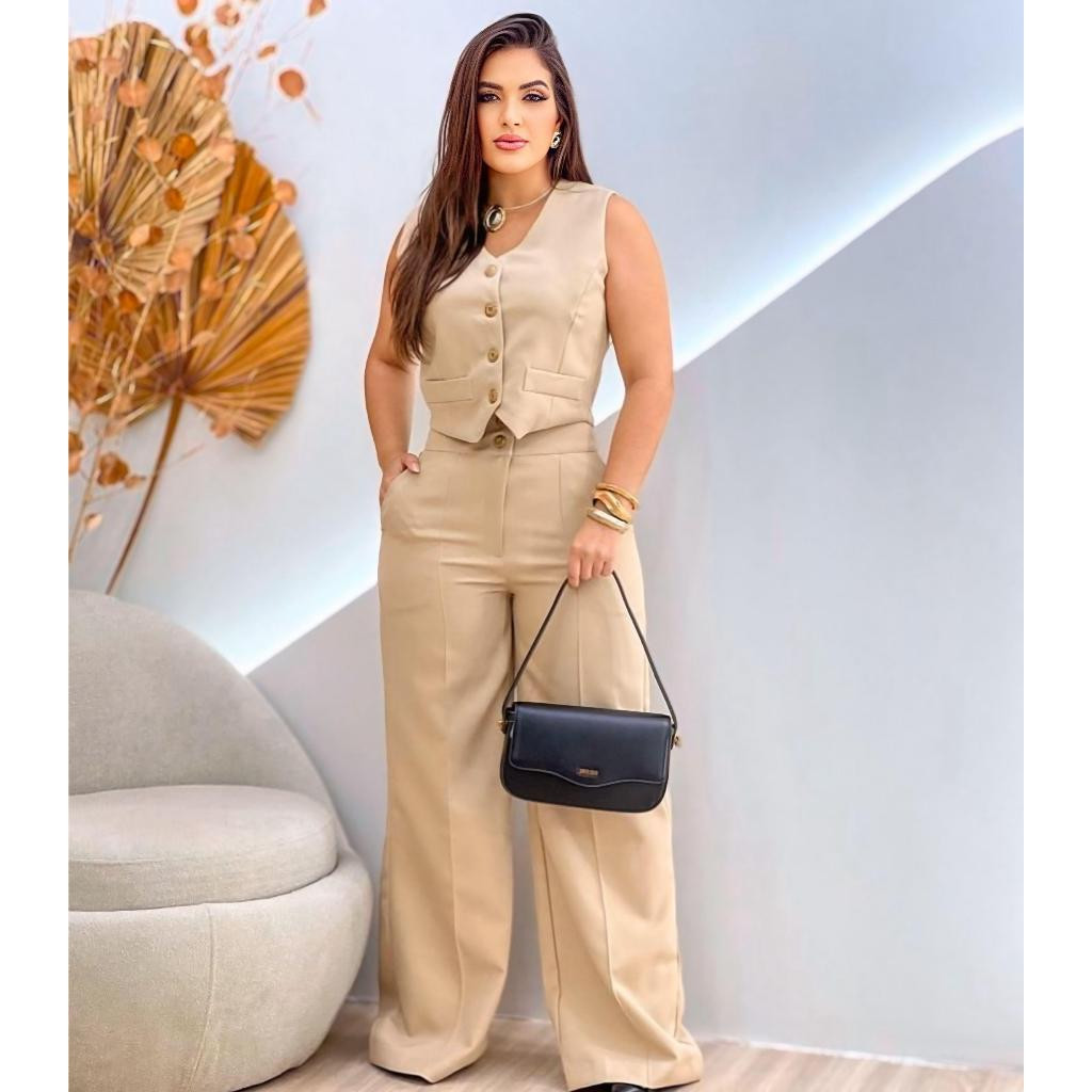 Conjunto Feminino Alfaiataria Calça Pantalona Wed Leg Com Colete Elegante Casual