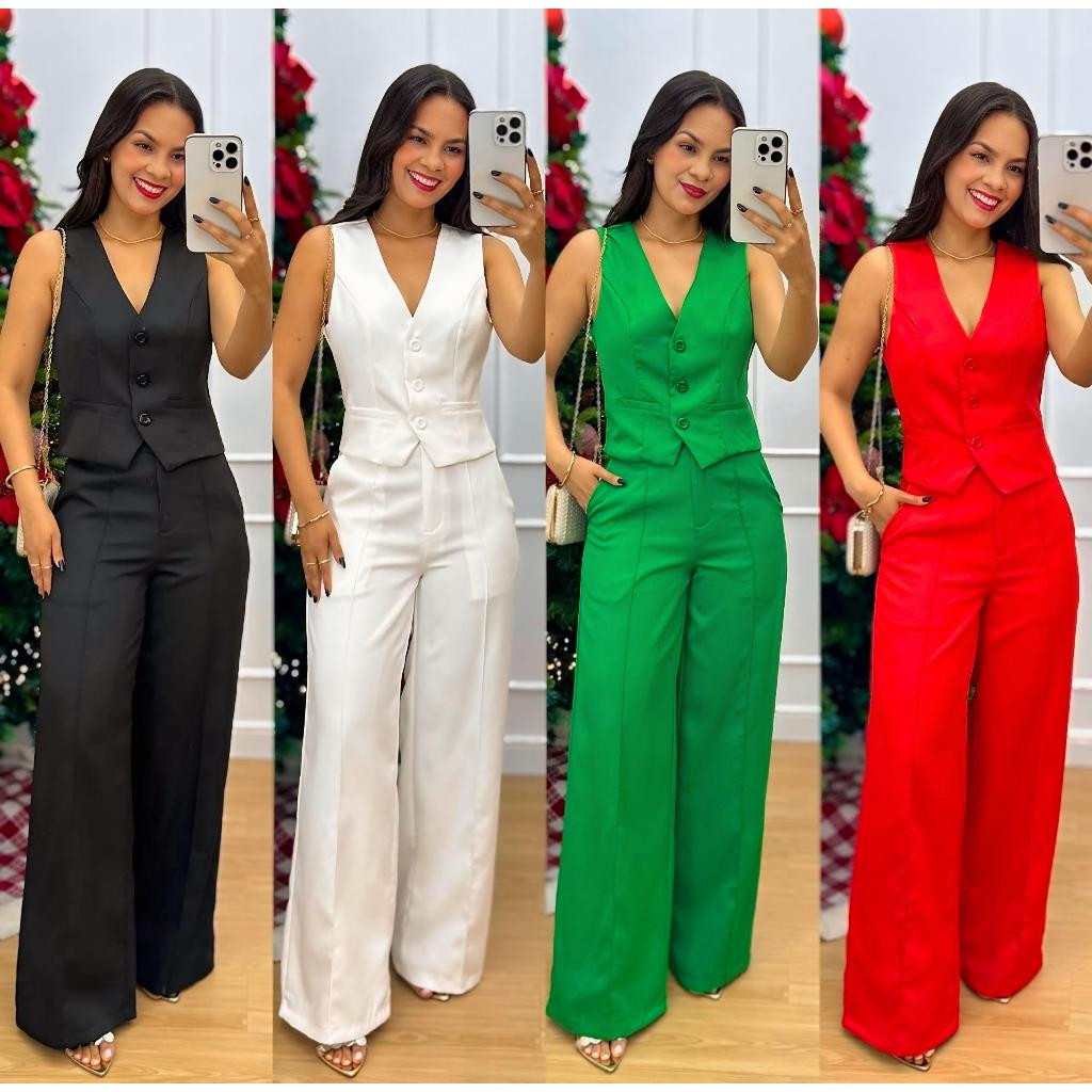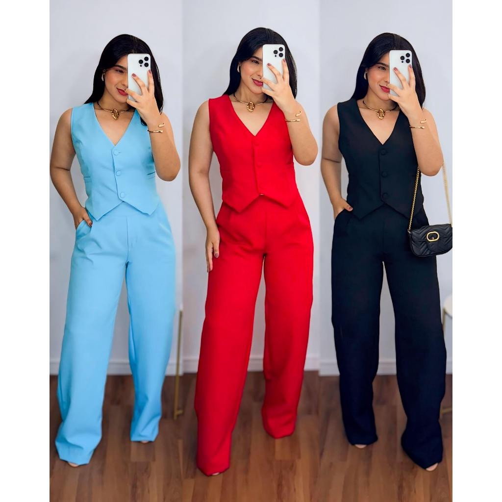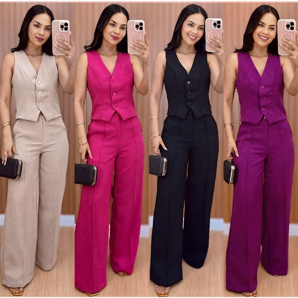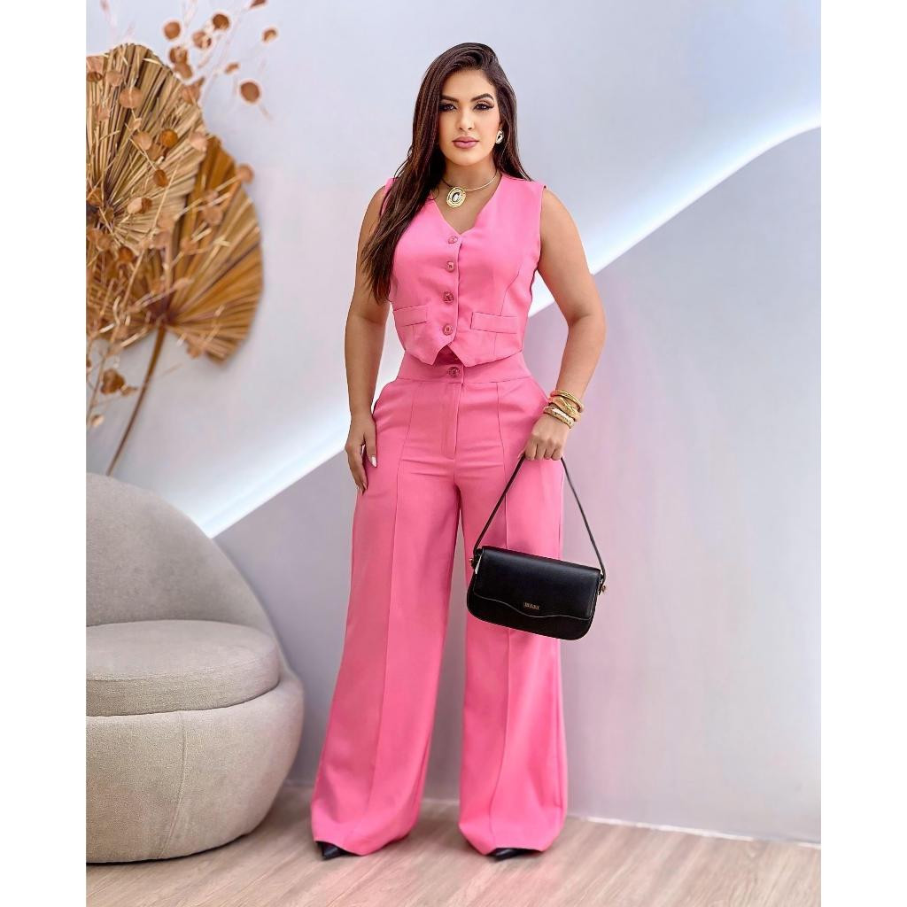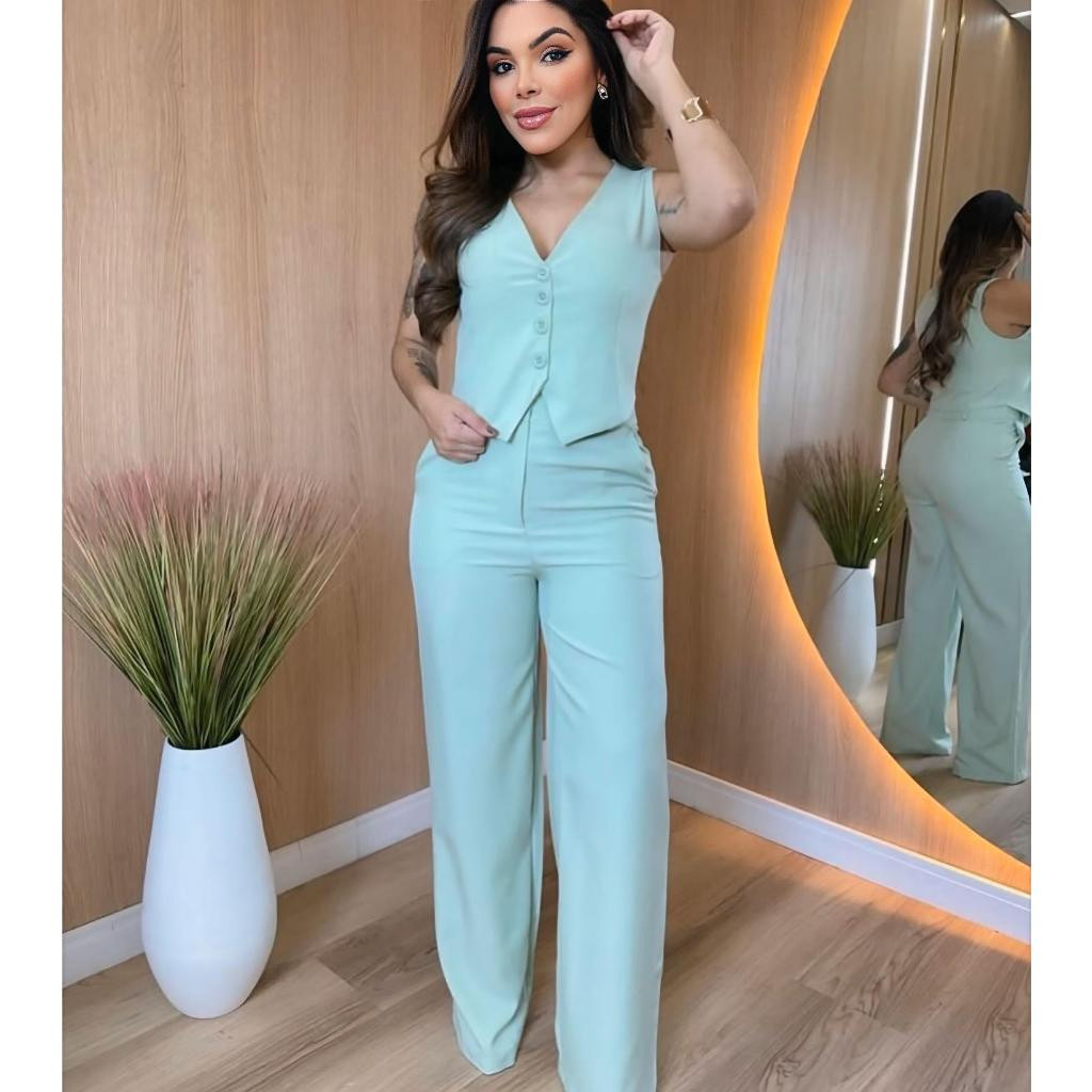 Conjunto Feminino Alfaiataria Calça Pantalona Wed Leg Com Colete Elegante Casual