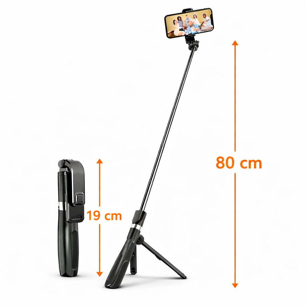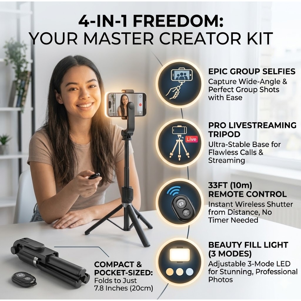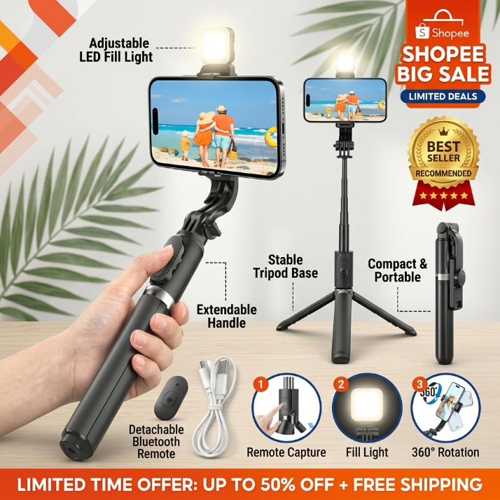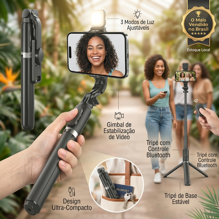 Tripé 360° Portátil com Luz LED | Estabilizador para Celular com Controle Bluetooth para Viagens, Fotos e Vídeos