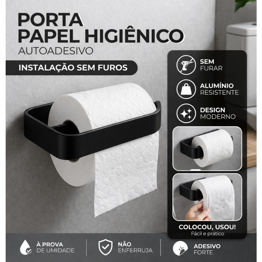 Porta Papel Higiênico Preto Suporte Banheiro Adesivo Sem Furo